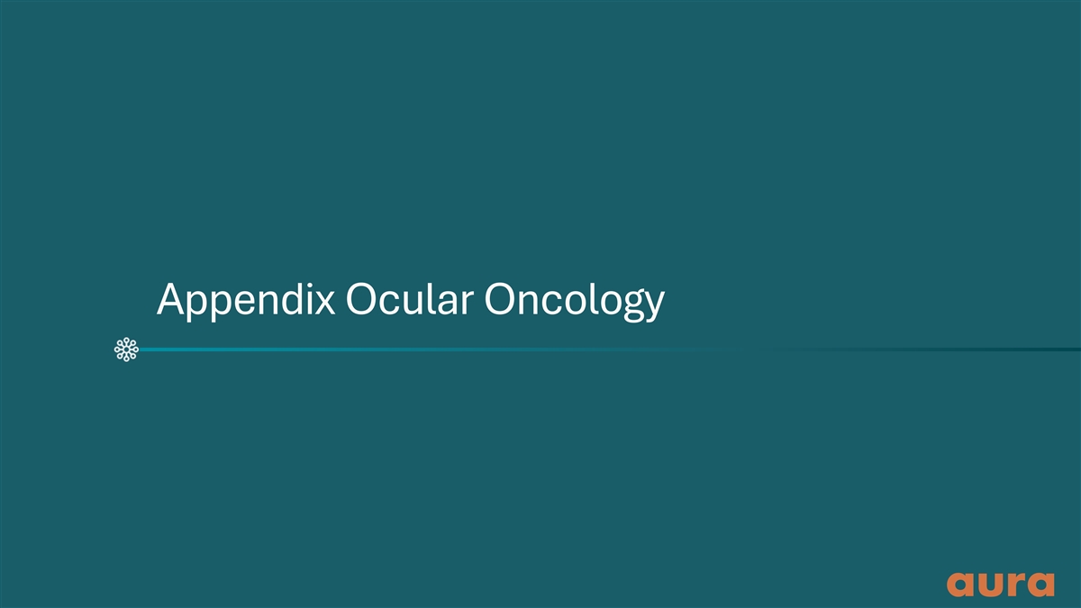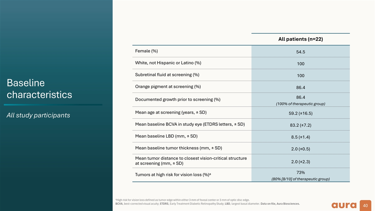 All patients (n=22) Female (%) 54.5 White, not Hispanic or Latino (%) 100 Subretinal fluid at screening (%) 100 Baseline Orange pigment at screening (%) 86.4 characteristics 86.4 Documented growth prior to screening (%) (100% of therapeutic group) Mean age at screening (years, ± SD) 59.2 (±16.5) All study participants Mean baseline BCVA in study eye (ETDRS letters, ± SD) 83.2 (±7.2) Mean baseline LBD (mm, ± SD) 8.5 (±1.4) Mean baseline tumor thickness (mm, ± SD) 2.0 (±0.5) Mean tumor distance to closest vision-critical structure 2.0 (±2.3) at screening (mm, ± SD) 73% a Tumors at high risk for vision loss (%) (80% [8/10] of therapeutic group) a High risk for vision loss defined as tumor edge within either 3 mm of foveal center or 3 mm of optic disc edge. BCVA, best-corrected visual acuity; ETDRS, Early Treatment Diabetic Retinopathy Study; LBD, largest basal diameter. Data on file, Aura Biosciences. 40