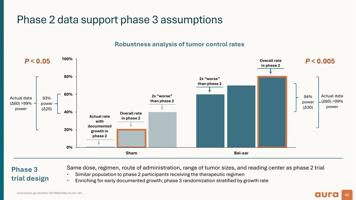Phase 2 data support phase 3 assumptions Robustness analysis of tumor control rates 100% Overall rate P < 0.05 P < 0.005 in phase 2 80% 2x “worse” than phase 2 60% 2x “worse” Actual data 94% Actual data 93% than phase 2 (Δ60) >99% power (Δ60) >99% power power (Δ30) power (Δ20) 40% Overall rate Actual rate in phase 2 with documented 20% growth in phase 2 0% Sham Bel-sar Same dose, regimen, route of administration, range of tumor sizes, and reading center as phase 2 trial Phase 3 • Similar population to phase 2 participants receiving the therapeutic regimen trial design • Enriching for early documented growth; phase 3 randomization stratified by growth rate ClinicalTrials.gov Identifier: NCT06007690; AU-011-301. 45