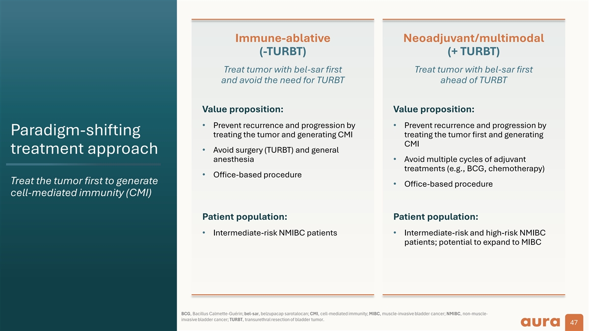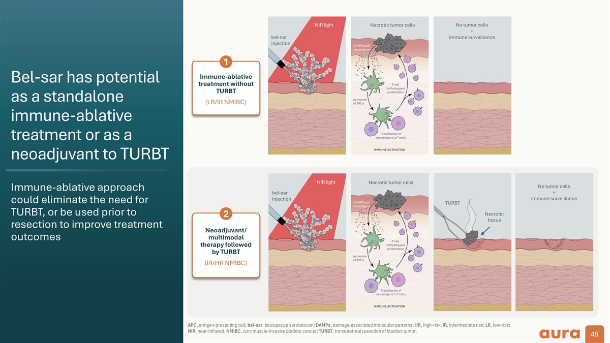 Immune-ablative Neoadjuvant/multimodal (-TURBT) (+ TURBT) Treat tumor with bel-sar first Treat tumor with bel-sar first and avoid the need for TURBT ahead of TURBT Value proposition: Value proposition: • Prevent recurrence and progression by • Prevent recurrence and progression by Paradigm-shifting treating the tumor and generating CMI treating the tumor first and generating CMI • Avoid surgery (TURBT) and general treatment approach anesthesia• Avoid multiple cycles of adjuvant treatments (e.g., BCG, chemotherapy) • Office-based procedure Treat the tumor first to generate • Office-based procedure cell-mediated immunity (CMI) Patient population: Patient population: • Intermediate-risk NMIBC patients• Intermediate-risk and high-risk NMIBC patients; potential to expand to MIBC BCG, Bacillus Calmette-Guérin; bel-sar, belzupacap sarotalocan; CMI, cell-mediated immunity; MIBC, muscle-invasive bladder cancer; NMIBC, non-muscle- invasive bladder cancer; TURBT, transurethral resection of bladder tumor. 47