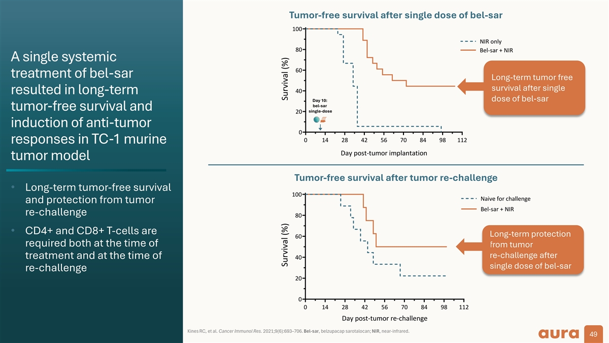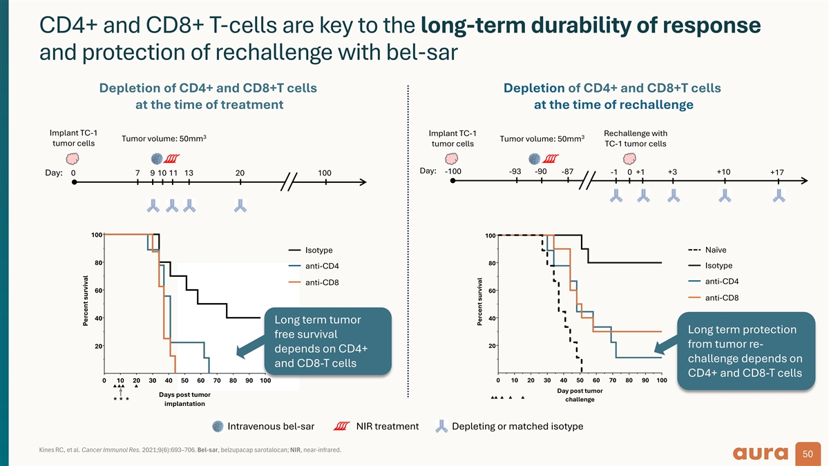 Tumor-free survival after single dose of bel-sar 100 NIR only 80 Bel-sar + NIR A single systemic 60 treatment of bel-sar Long-term tumor free survival after single 40 resulted in long-term dose of bel-sar Day 10: bel-sar tumor-free survival and single-dose 20 induction of anti-tumor 0 0 14 28 42 56 70 84 98 112 responses in TC-1 murine Day post-tumor implantation tumor model Tumor-free survival after tumor re-challenge • Long-term tumor-free survival 100 Naive for challenge and protection from tumor Bel-sar + NIR re-challenge 80 • CD4+ and CD8+ T-cells are Long-term protection 60 required both at the time of from tumor re-challenge after treatment and at the time of 40 single dose of bel-sar re-challenge 20 0 0 14 28 42 56 70 84 98 112 Day post-tumor re-challenge Kines RC, et al. Cancer Immunol Res. 2021;9(6):693–706. Bel-sar, belzupacap sarotalocan; NIR, near-infrared. 49 Survival (%) Survival (%)