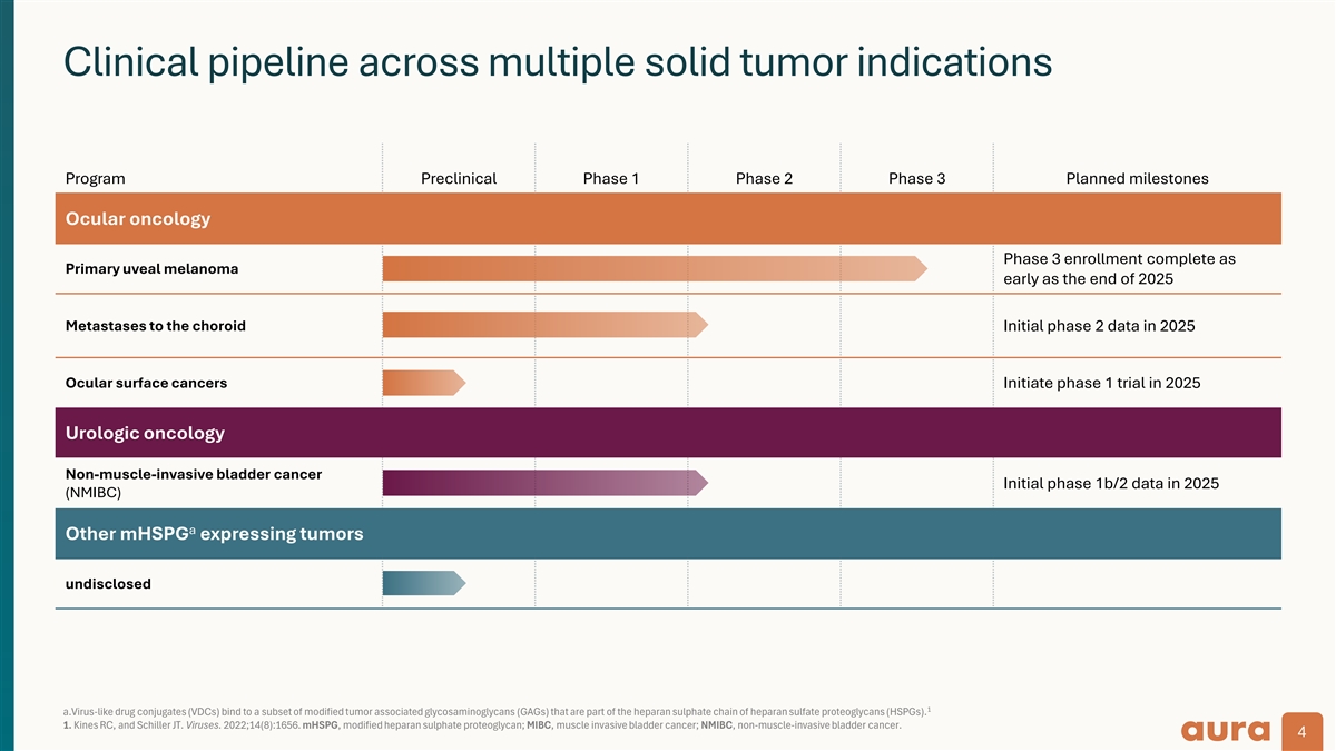 Well positioned with multiple near-term clinical catalysts Novel class of drugs Positive clinical data in Large market opportunity Key upcoming virus-like drug conjugates multiple indications in areas of unmet need catalysts VDCs have the potential to Positive phase 2 data in early- Ocular oncology Multiple clinical data 1–7 transform early cancer stage choroidal melanoma ~66,000 patients/yr (US/EU) readouts expected in 2025: treatment with phase 3 ongoing initial data in phase 1b/2 in under FDA SPA agreement Urologic oncology NMIBC and phase 2 in 8 Novel MoA: direct tumor cell ~500,000 patients/yr (globally) metastases to the choroid killing and immune cell Multiple clinical complete activation responses with single low dose Current cash expected to fund in phase 1 trial in NMIBC operations into 1H 2027 1. Yu G-P et al. Am J Ophthalmol. 2003;135(6):800-6. 2. Triay E et al. Br J Ophthalmol. 2009;93(11):1524-8. 3. Newton R et al. Lancet. 1996;347(9013):1450-1. 4. Dalvin LA. Br J Ophthalmol. 2018;102(12):1728-1734. 5. Sun EC et al. Cancer Epidemiol Biomarkers Prev. 1997;6(2):73-7. 6. Epidemiology analysis for choroidal melanoma and choroidal metastasis by ClearView Healthcare Partners and Putman. 7. American Cancer Society. Key statistics for retinoblastoma. Available at: https://www.cancer.org/cancer/types/retinoblastoma/about/key-statistics.html. Accessed Sept 5, 2024. 8. Bladder cancer. Putnam & Assoc. Epidemiology Analysis. FDA, United States Food and Drug Administration; SPA, Special Protocol Assessment; VDC, Virus-like drug conjugate, MoA, Mechanism of action; NMIBC, Non-muscle-invasive bladder cancer 3