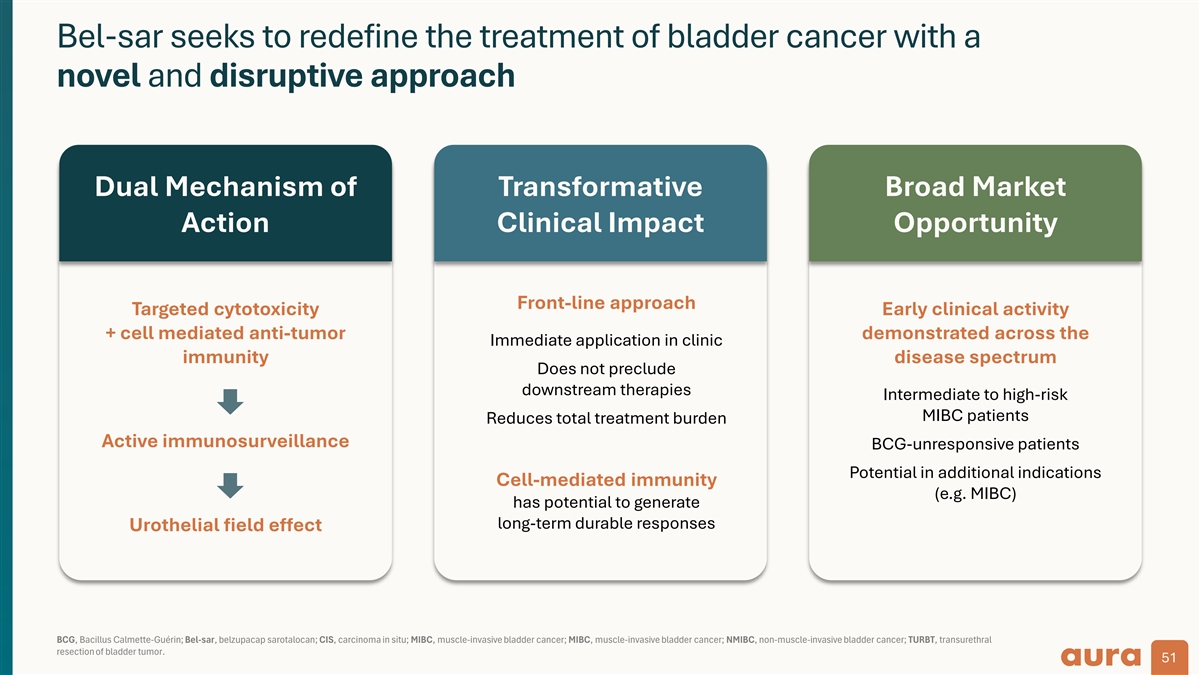 Bel-sar seeks to redefine the treatment of bladder cancer with a novel and disruptive approach Dual Mechanism of Transformative Broad Market Action Clinical Impact Opportunity Front-line approach Targeted cytotoxicity Early clinical activity + cell mediated anti-tumor demonstrated across the Immediate application in clinic immunity disease spectrum Does not preclude downstream therapies Intermediate to high-risk MIBC patients Reduces total treatment burden Active immunosurveillance BCG-unresponsive patients Potential in additional indications Cell-mediated immunity (e.g. MIBC) has potential to generate long-term durable responses Urothelial field effect BCG, Bacillus Calmette-Guérin; Bel-sar, belzupacap sarotalocan; CIS, carcinoma in situ; MIBC, muscle-invasive bladder cancer; MIBC, muscle-invasive bladder cancer; NMIBC, non-muscle-invasive bladder cancer; TURBT, transurethral resection of bladder tumor. 51 51