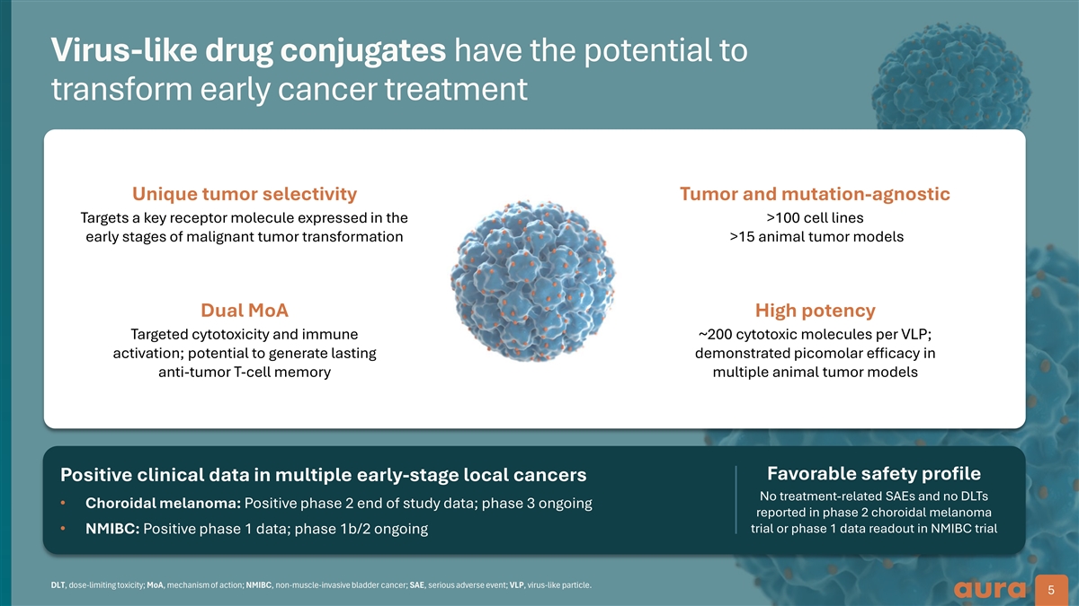 Clinical pipeline across multiple solid tumor indications Program Preclinical Phase 1 Phase 2 Phase 3 Planned milestones Ocular oncology Phase 3 enrollment complete as Primary uveal melanoma early as the end of 2025 Metastases to the choroid Initial phase 2 data in 2025 Ocular surface cancers Initiate phase 1 trial in 2025 Urologic oncology Non-muscle-invasive bladder cancer Initial phase 1b/2 data in 2025 (NMIBC) a Other mHSPG expressing tumors undisclosed 1 a.Virus-like drug conjugates (VDCs) bind to a subset of modified tumor associated glycosaminoglycans (GAGs) that are part of the heparan sulphate chain of heparan sulfate proteoglycans (HSPGs). 1. Kines RC, and Schiller JT. Viruses. 2022;14(8):1656. mHSPG, modified heparan sulphate proteoglycan; MIBC, muscle invasive bladder cancer; NMIBC, non-muscle-invasive bladder cancer. 4