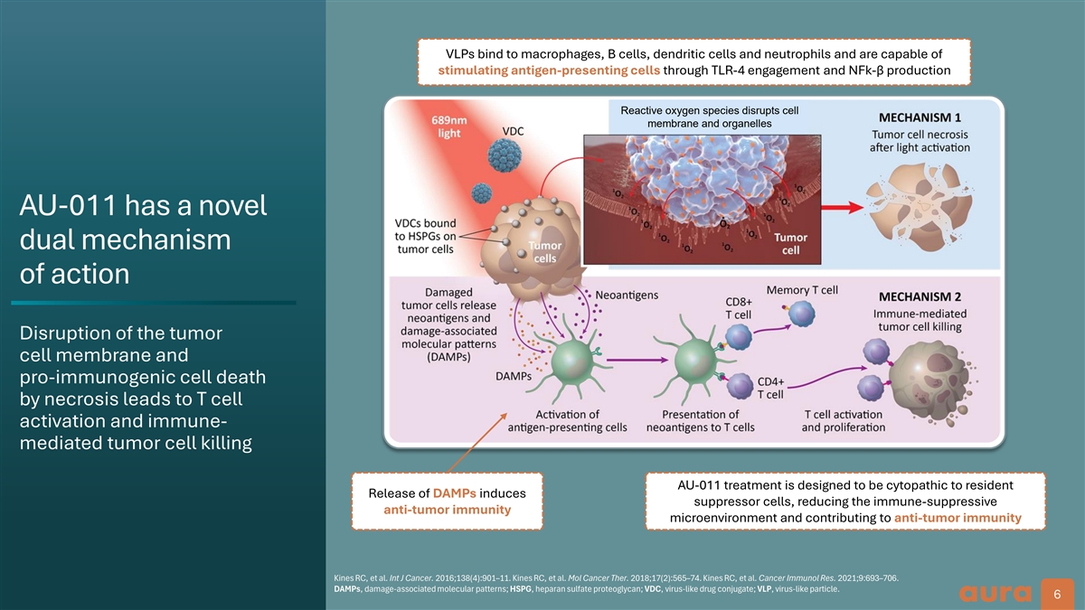 VLPs bind to macrophages, B cells, dendritic cells and neutrophils and are capable of stimulating antigen-presenting cells through TLR-4 engagement and NFk-β production Reactive oxygen species disrupts cell membrane and organelles AU-011 has a novel dual mechanism of action Disruption of the tumor cell membrane and pro-immunogenic cell death by necrosis leads to T cell activation and immune- mediated tumor cell killing AU-011 treatment is designed to be cytopathic to resident Release of DAMPs induces suppressor cells, reducing the immune-suppressive anti-tumor immunity microenvironment and contributing to anti-tumor immunity Kines RC, et al. Int J Cancer. 2016;138(4):901–11. Kines RC, et al. Mol Cancer Ther. 2018;17(2):565–74. Kines RC, et al. Cancer Immunol Res. 2021;9:693–706. DAMPs, damage-associated molecular patterns; HSPG, heparan sulfate proteoglycan; VDC, virus-like drug conjugate; VLP, virus-like particle. 6