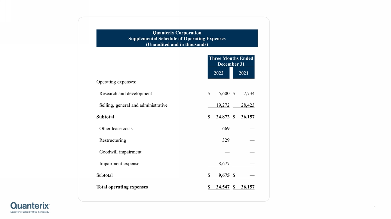 1 Quanterix Corporation Supplemental Schedule of Operating Expenses (Unaudited and in thousands) Three Months Ended December 31 2022 2021 Operating expenses: Research and development $ 5,600 $ 7,734 Selling, general and administrative 19,272 28,423 Subtotal $ 24,872 $ 36,157 Other lease costs 669 — Restructuring 329 — Goodwill impairment — — Impairment expense 8,677 — Subtotal $ 9,675 $ — Total operating expenses $ 34,547 $ 36,157