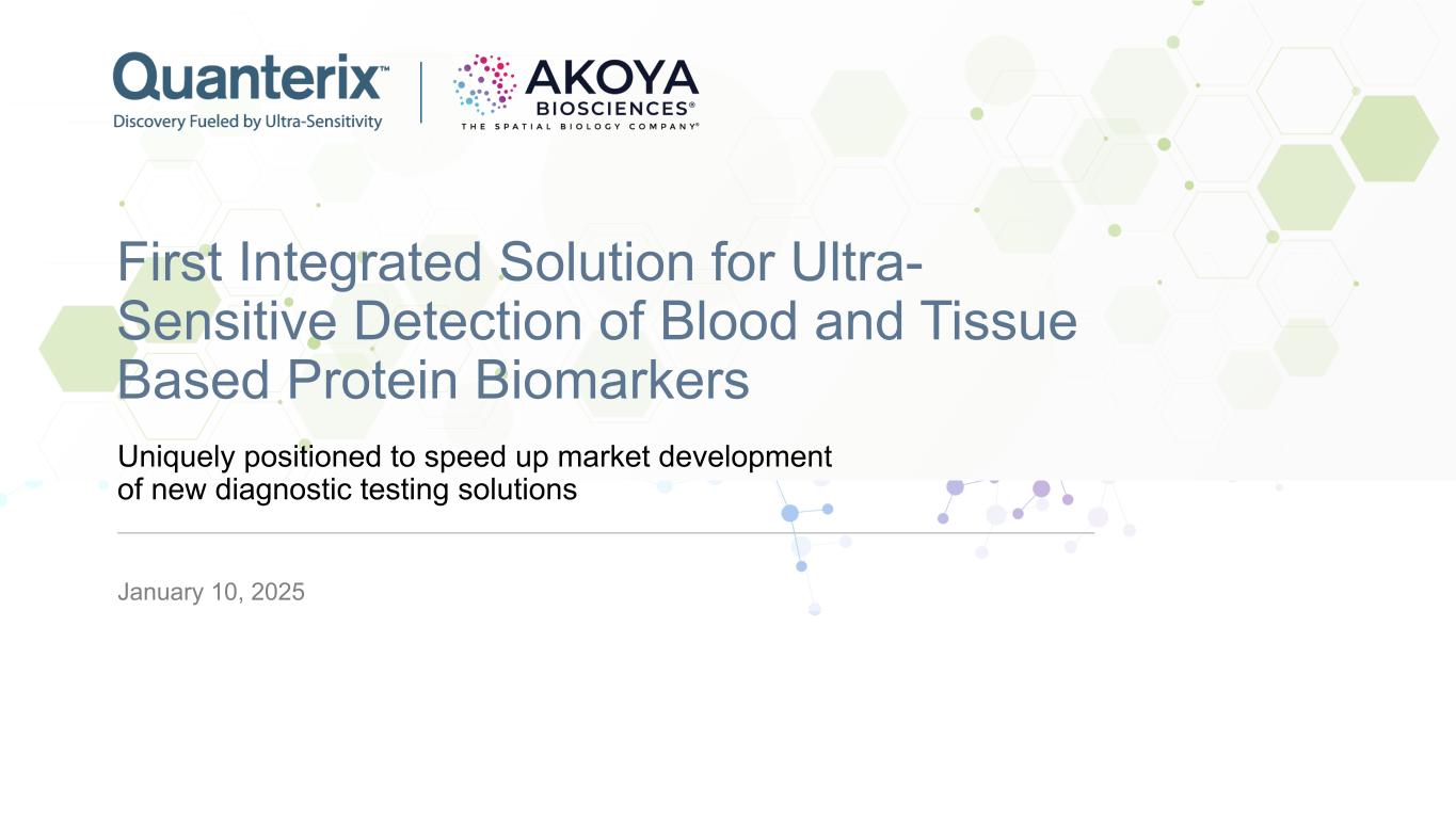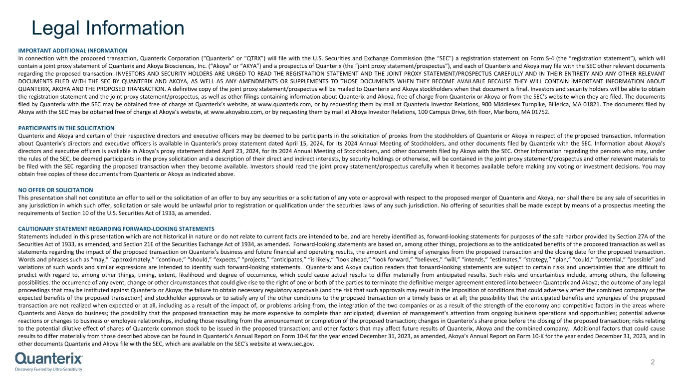 2 IMPORTANT ADDITIONAL INFORMATION In connection with the proposed transaction, Quanterix Corporation (“Quanterix” or “QTRX”) will file with the U.S. Securities and Exchange Commission (the “SEC”) a registration statement on Form S-4 (the “registration statement”), which will contain a joint proxy statement of Quanterix and Akoya Biosciences, Inc. (“Akoya” or “AKYA”) and a prospectus of Quanterix (the “joint proxy statement/prospectus”), and each of Quanterix and Akoya may file with the SEC other relevant documents regarding the proposed transaction. INVESTORS AND SECURITY HOLDERS ARE URGED TO READ THE REGISTRATION STATEMENT AND THE JOINT PROXY STATEMENT/PROSPECTUS CAREFULLY AND IN THEIR ENTIRETY AND ANY OTHER RELEVANT DOCUMENTS FILED WITH THE SEC BY QUANTERIX AND AKOYA, AS WELL AS ANY AMENDMENTS OR SUPPLEMENTS TO THOSE DOCUMENTS WHEN THEY BECOME AVAILABLE BECAUSE THEY WILL CONTAIN IMPORTANT INFORMATION ABOUT QUANTERIX, AKOYA AND THE PROPOSED TRANSACTION. A definitive copy of the joint proxy statement/prospectus will be mailed to Quanterix and Akoya stockholders when that document is final. Investors and security holders will be able to obtain the registration statement and the joint proxy statement/prospectus, as well as other filings containing information about Quanterix and Akoya, free of charge from Quanterix or Akoya or from the SEC’s website when they are filed. The documents filed by Quanterix with the SEC may be obtained free of charge at Quanterix’s website, at www.quanterix.com, or by requesting them by mail at Quanterix Investor Relations, 900 Middlesex Turnpike, Billerica, MA 01821. The documents filed by Akoya with the SEC may be obtained free of charge at Akoya’s website, at www.akoyabio.com, or by requesting them by mail at Akoya Investor Relations, 100 Campus Drive, 6th floor, Marlboro, MA 01752. PARTICIPANTS IN THE SOLICITATION Quanterix and Akoya and certain of their respective directors and executive officers may be deemed to be participants in the solicitation of proxies from the stockholders of Quanterix or Akoya in respect of the proposed transaction. Information about Quanterix’s directors and executive officers is available in Quanterix’s proxy statement dated April 15, 2024, for its 2024 Annual Meeting of Stockholders, and other documents filed by Quanterix with the SEC. Information about Akoya’s directors and executive officers is available in Akoya’s proxy statement dated April 23, 2024, for its 2024 Annual Meeting of Stockholders, and other documents filed by Akoya with the SEC. Other information regarding the persons who may, under the rules of the SEC, be deemed participants in the proxy solicitation and a description of their direct and indirect interests, by security holdings or otherwise, will be contained in the joint proxy statement/prospectus and other relevant materials to be filed with the SEC regarding the proposed transaction when they become available. Investors should read the joint proxy statement/prospectus carefully when it becomes available before making any voting or investment decisions. You may obtain free copies of these documents from Quanterix or Akoya as indicated above. NO OFFER OR SOLICITATION This presentation shall not constitute an offer to sell or the solicitation of an offer to buy any securities or a solicitation of any vote or approval with respect to the proposed merger of Quanterix and Akoya, nor shall there be any sale of securities in any jurisdiction in which such offer, solicitation or sale would be unlawful prior to registration or qualification under the securities laws of any such jurisdiction. No offering of securities shall be made except by means of a prospectus meeting the requirements of Section 10 of the U.S. Securities Act of 1933, as amended. CAUTIONARY STATEMENT REGARDING FORWARD-LOOKING STATEMENTS Statements included in this presentation which are not historical in nature or do not relate to current facts are intended to be, and are hereby identified as, forward-looking statements for purposes of the safe harbor provided by Section 27A of the Securities Act of 1933, as amended, and Section 21E of the Securities Exchange Act of 1934, as amended. Forward-looking statements are based on, among other things, projections as to the anticipated benefits of the proposed transaction as well as statements regarding the impact of the proposed transaction on Quanterix’s business and future financial and operating results, the amount and timing of synergies from the proposed transaction and the closing date for the proposed transaction. Words and phrases such as “may,” “approximately,” “continue,” “should,” “expects,” “projects,” “anticipates,” “is likely,” “look ahead,” “look forward,” “believes,” “will,” “intends,” “estimates,” “strategy,” “plan,” “could,” “potential,” “possible” and variations of such words and similar expressions are intended to identify such forward-looking statements. Quanterix and Akoya caution readers that forward-looking statements are subject to certain risks and uncertainties that are difficult to predict with regard to, among other things, timing, extent, likelihood and degree of occurrence, which could cause actual results to differ materially from anticipated results. Such risks and uncertainties include, among others, the following possibilities: the occurrence of any event, change or other circumstances that could give rise to the right of one or both of the parties to terminate the definitive merger agreement entered into between Quanterix and Akoya; the outcome of any legal proceedings that may be instituted against Quanterix or Akoya; the failure to obtain necessary regulatory approvals (and the risk that such approvals may result in the imposition of conditions that could adversely affect the combined company or the expected benefits of the proposed transaction) and
