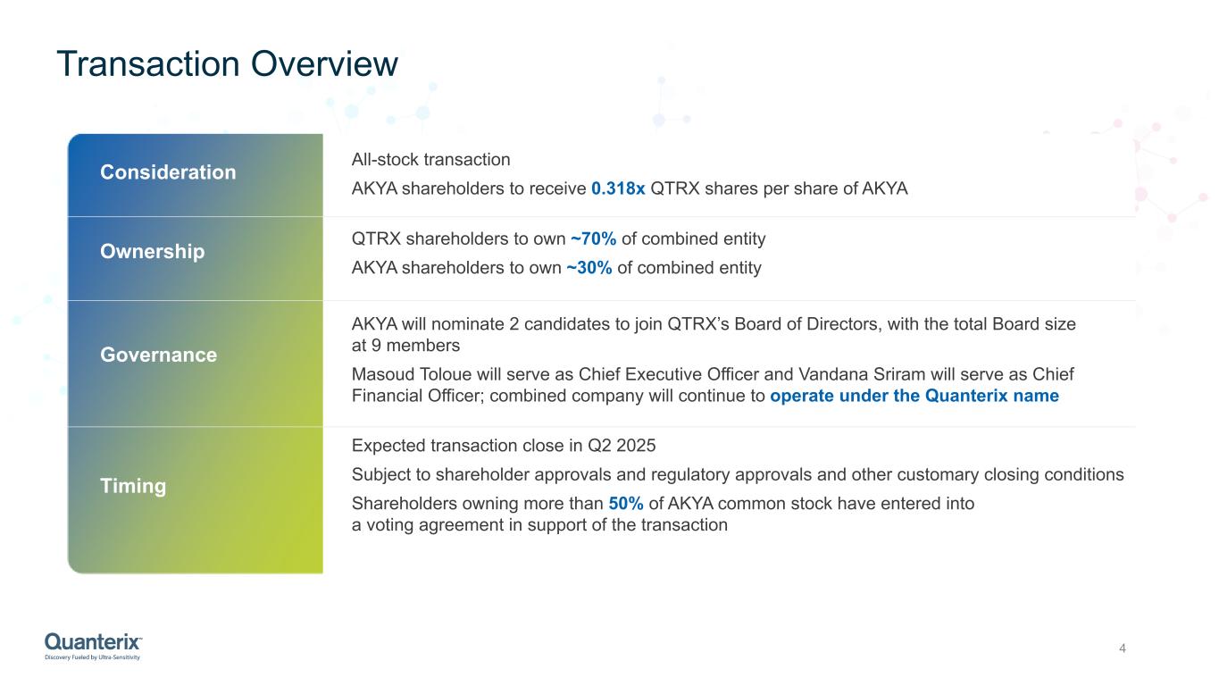 3 CAUTIONARY STATEMENT REGARDING FORWARD-LOOKING STATEMENTS (CONTD.) All forward-looking statements, expressed or implied, included in this presentation are expressly qualified in their entirety by the cautionary statements contained or referred to herein. If one or more events related to these or other risks or uncertainties materialize, or if Quanterix’s or Akoya’s underlying assumptions prove to be incorrect, actual results may differ materially from what Quanterix and Akoya anticipate. Quanterix and Akoya caution readers not to place undue reliance on any such forward-looking statements, which speak only as of the date they are made and are based on information available at that time. Neither Quanterix nor Akoya assumes any obligation to update or otherwise revise any forward-looking statements to reflect circumstances or events that occur after the date the forward-looking statements were made or to reflect the occurrence of unanticipated events except as required by federal securities laws. USE OF FINANCIAL PROJECTIONS This presentation contains projected financial information with respect to the combined company that will result from the proposed transaction, if consummated. Such projected financial information constitutes forward-looking information, is for illustrative purposes only and should not be relied upon as necessarily being indicative of future results. The assumptions and estimates underlying such projected financial information are inherently uncertain and are subject to a wide variety of significant business, economic, competitive and other risks and uncertainties that could cause actual results to differ materially from those contained in the projected financial information. Actual results may differ materially from the results contemplated by the projected financial information contained in this presentation, and the inclusion of such information in this presentation should not be regarded as a representation by any person that the results reflected in such forecasts will be achieved. Neither Quanterix’s nor Akoya’s independent auditors have audited, reviewed, compiled or performed any procedures with respect to the projections for purposes of their inclusion in this presentation, and accordingly, neither of them expressed an opinion or provided any other form of assurance with respect thereto for purposes of this presentation. USE OF NON-GAAP FINANCIAL MEASURES To supplement Quanterix's preliminary financial information presented on a GAAP basis, Quanterix has provided certain non-GAAP financial measures, including non-GAAP gross margin. Management uses these non-GAAP measures to evaluate our operating performance in manner that allows for meaningful period-to-period comparison and analysis of trends in our business and our competitors. Management believes that presentation of these non-GAAP measures provides useful information to investors in assessing our operating performance within our industry and in order to allow comparability to the presentation of other companies in our industry. The non-GAAP financial information presented herein should be considered in conjunction with, and not as a substitute for, the financial information presented in accordance with GAAP. Unless otherwise specified, all information contained herein is provided as of September 30, 2024. Legal Information
