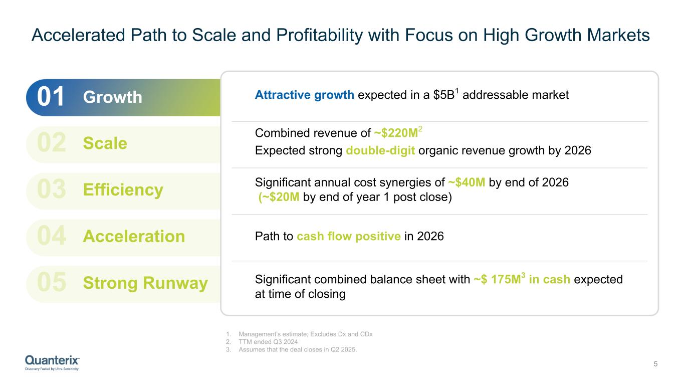 Transaction Overview 4 All-stock transaction AKYA shareholders to receive 0.318x QTRX shares per share of AKYA QTRX shareholders to own ~70% of combined entity AKYA shareholders to own ~30% of combined entity AKYA will nominate 2 candidates to join QTRX’s Board of Directors, with the total Board size at 9 members Masoud Toloue will serve as Chief Executive Officer and Vandana Sriram will serve as Chief Financial Officer; combined company will continue to operate under the Quanterix name Expected transaction close in Q2 2025 Subject to shareholder approvals and regulatory approvals and other customary closing conditions Shareholders owning more than 50% of AKYA common stock have entered into a voting agreement in support of the transaction Consideration Ownership Governance Timing