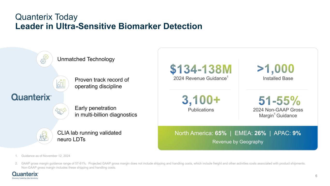 Accelerated Path to Scale and Profitability with Focus on High Growth Markets 5 01 Growth 02 Scale 03 Efficiency 04 Acceleration 05 Strong Runway Combined revenue of ~$220M2 Expected strong double-digit organic revenue growth by 2026 Significant annual cost synergies of ~$40M by end of 2026 (~$20M by end of year 1 post close) Path to cash flow positive in 2026 Significant combined balance sheet with ~$ 175M3 in cash expected at time of closing Attractive growth expected in a $5B1 addressable market 1. Management’s estimate; Excludes Dx and CDx 2. TTM ended Q3 2024 3. Assumes that the deal closes in Q2 2025.