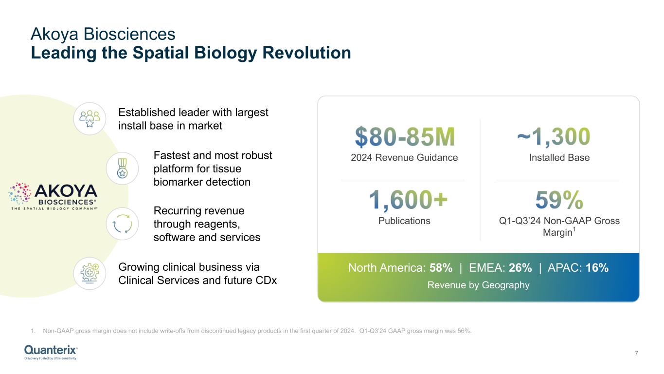 Akoya Biosciences Leading the Spatial Biology Revolution 7 Publications Installed Base2024 Revenue Guidance Q1-Q3’24 Non-GAAP Gross Margin1 Established leader with largest install base in market Fastest and most robust platform for tissue biomarker detection Recurring revenue through reagents, software and services Growing clinical business via Clinical Services and future CDx North America: 58% | EMEA: 26% | APAC: 16% Revenue by Geography 1. Non-GAAP gross margin does not include write-offs from discontinued legacy products in the first quarter of 2024. Q1-Q3’24 GAAP gross margin was 56%.