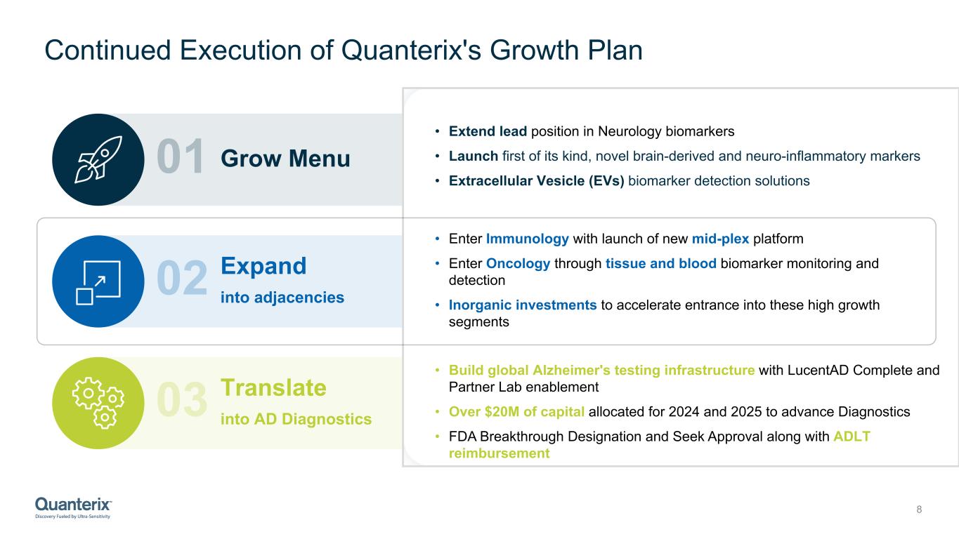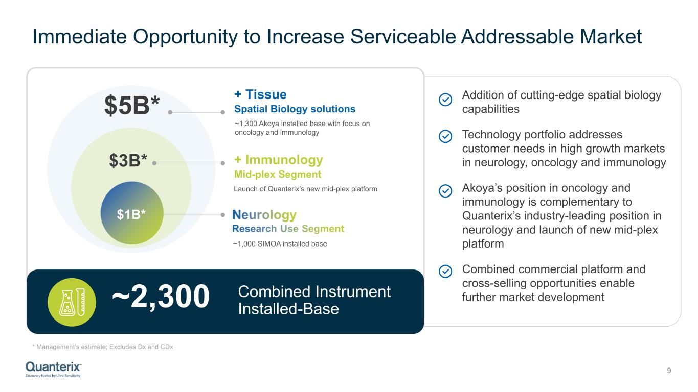 Continued Execution of Quanterix's Growth Plan 8 02 03 01 Grow Menu Expand into adjacencies Translate into AD Diagnostics • Extend lead position in Neurology biomarkers • Launch first of its kind, novel brain-derived and neuro-inflammatory markers • Extracellular Vesicle (EVs) biomarker detection solutions • Enter Immunology with launch of new mid-plex platform • Enter Oncology through tissue and blood biomarker monitoring and detection • Inorganic investments to accelerate entrance into these high growth segments • Build global Alzheimer's testing infrastructure with LucentAD Complete and Partner Lab enablement • Over $20M of capital allocated for 2024 and 2025 to advance Diagnostics • FDA Breakthrough Designation and Seek Approval along with ADLT reimbursement