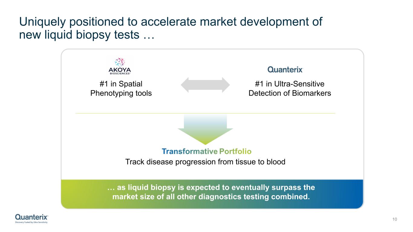 Immediate Opportunity to Increase Serviceable Addressable Market * Management’s estimate; Excludes Dx and CDx 9 Addition of cutting-edge spatial biology capabilities Technology portfolio addresses customer needs in high growth markets in neurology, oncology and immunology Akoya’s position in oncology and immunology is complementary to Quanterix’s industry-leading position in neurology and launch of new mid-plex platform Combined commercial platform and cross-selling opportunities enable further market developmentCombined Instrument Installed-Base ~2,300 $3B* $5B* ~1,000 SIMOA installed base Launch of Quanterix’s new mid-plex platform + Immunology Mid-plex Segment + Tissue Spatial Biology solutions ~1,300 Akoya installed base with focus on oncology and immunology $1B*