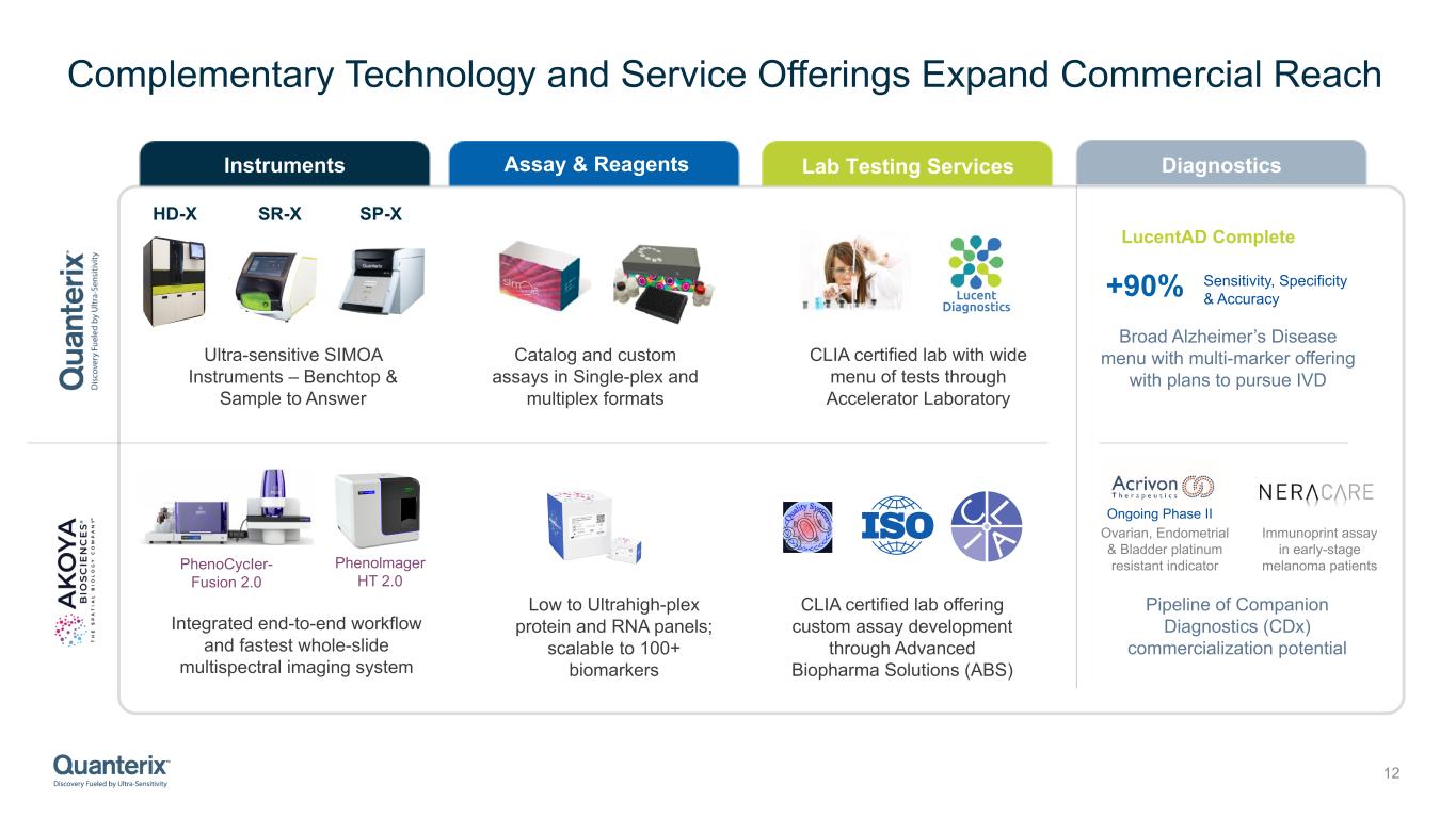 Uniting Clinical and Anatomical Pathology 11 ü Liquid biopsy to tissue of origin ü Choosing right treatment ü Monitoring of tumor treatment ü Continuous monitoring ü Assess Minimum Residual Disease ü Measure therapy efficacy ü Fewer biopsies First integrated dashboard harmonizing pathologist toolset Integrated approach from tissue to blood Tissue discovery translated into blood biomarkers One partner: From discovery to clinic Clinical Pathology Blood Tissue Anatomical Pathology