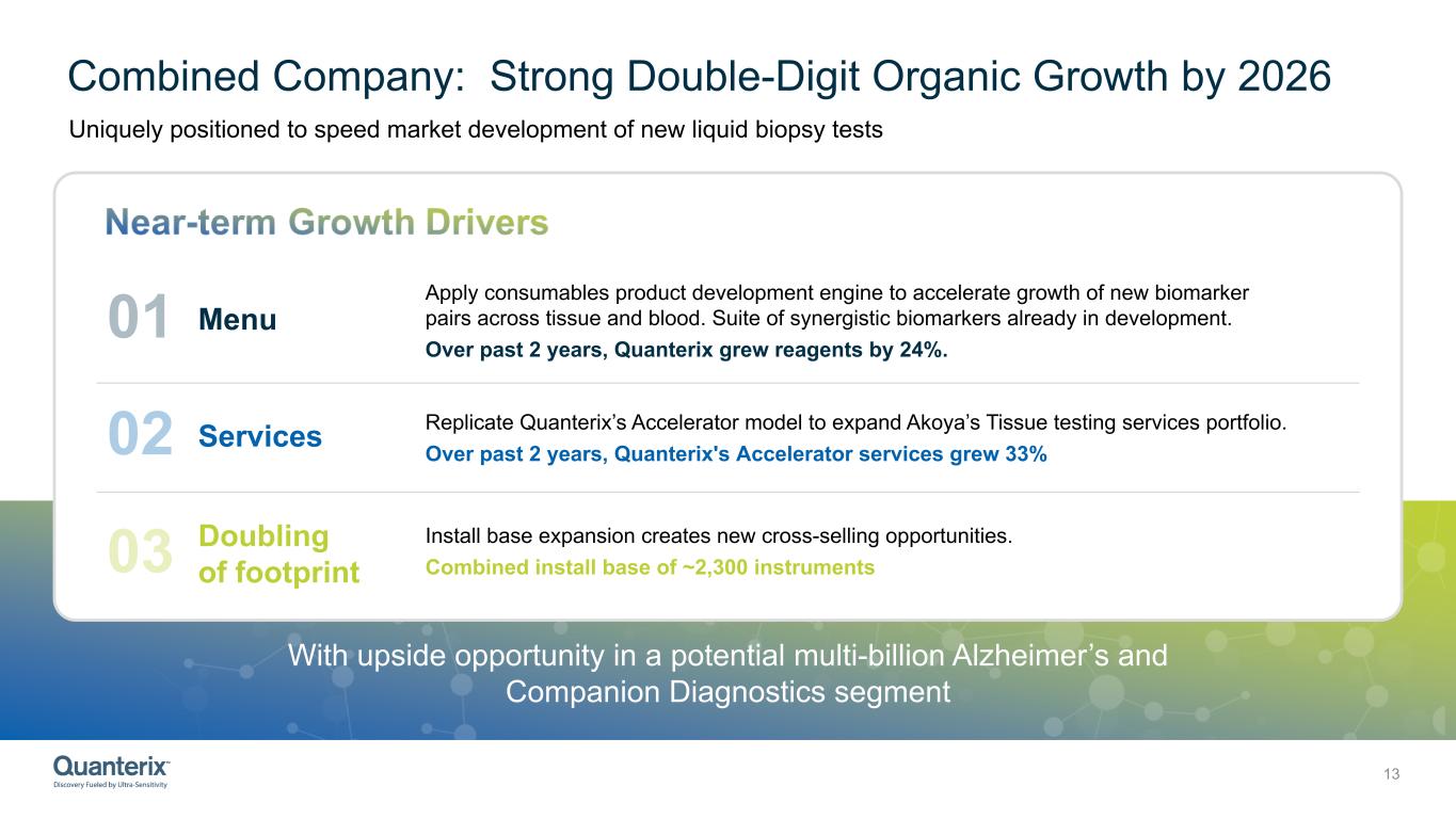 Complementary Technology and Service Offerings Expand Commercial Reach 12 Assay & ReagentsInstruments Lab Testing Services HD-X SR-X SP-X Ultra-sensitive SIMOA Instruments – Benchtop & Sample to Answer Catalog and custom assays in Single-plex and multiplex formats CLIA certified lab with wide menu of tests through Accelerator Laboratory Integrated end-to-end workflow and fastest whole-slide multispectral imaging system Low to Ultrahigh-plex protein and RNA panels; scalable to 100+ biomarkers CLIA certified lab offering custom assay development through Advanced Biopharma Solutions (ABS) Diagnostics +90% Broad Alzheimer’s Disease menu with multi-marker offering with plans to pursue IVD LucentAD Complete Ongoing Phase II Immunoprint assay in early-stage melanoma patients Ovarian, Endometrial & Bladder platinum resistant indicator Pipeline of Companion Diagnostics (CDx) commercialization potential Sensitivity, Specificity & Accuracy PhenoCycIer- Fusion 2.0 Phenolmager HT 2.0