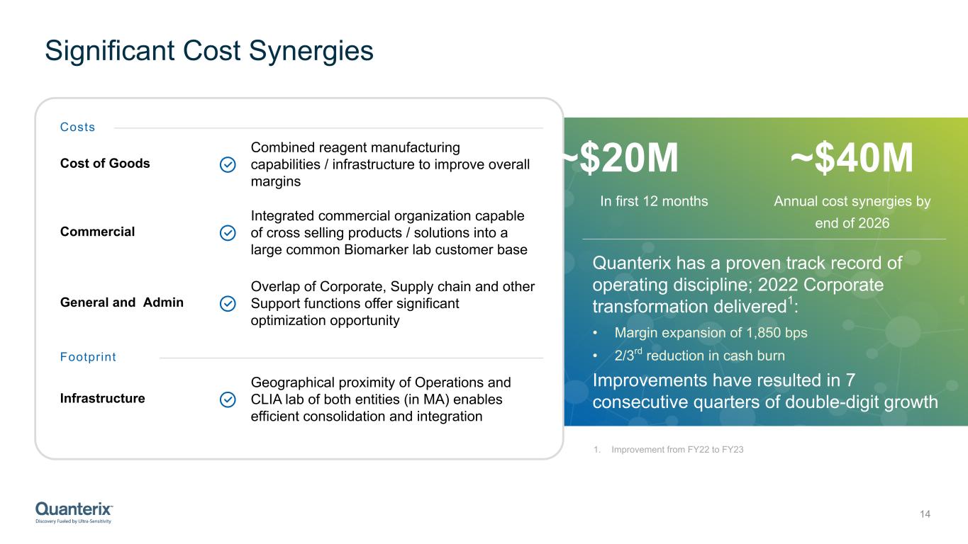 Combined Company: Strong Double-Digit Organic Growth by 2026 13 Uniquely positioned to speed market development of new liquid biopsy tests Apply consumables product development engine to accelerate growth of new biomarker pairs across tissue and blood. Suite of synergistic biomarkers already in development. Over past 2 years, Quanterix grew reagents by 24%. Menu01 Replicate Quanterix’s Accelerator model to expand Akoya’s Tissue testing services portfolio. Over past 2 years, Quanterix's Accelerator services grew 33%Services02 Install base expansion creates new cross-selling opportunities. Combined install base of ~2,300 instruments Doubling of footprint03 With upside opportunity in a potential multi-billion Alzheimer’s and Companion Diagnostics segment