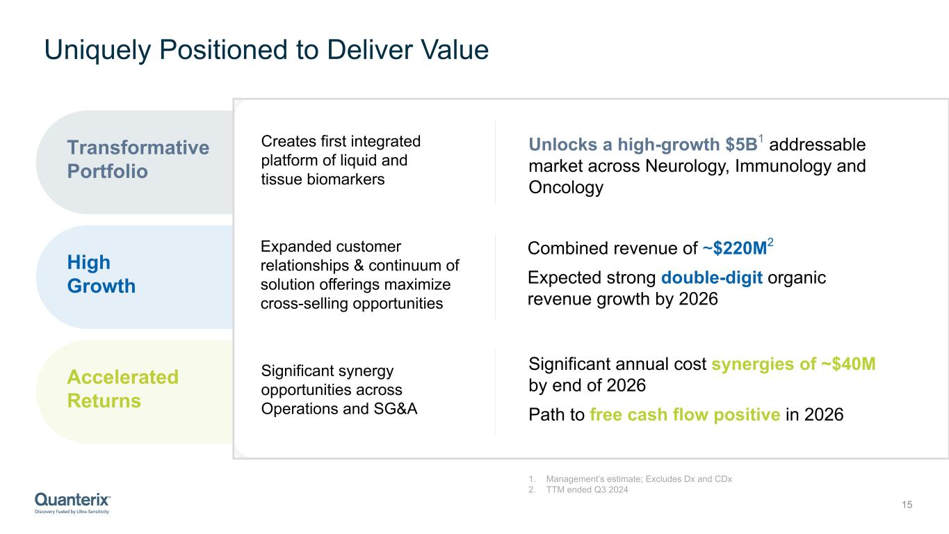 Significant Cost Synergies 14 General and Admin Costs Cost of Goods Combined reagent manufacturing capabilities / infrastructure to improve overall margins Overlap of Corporate, Supply chain and other Support functions offer significant optimization opportunity Footprint Infrastructure Geographical proximity of Operations and CLIA lab of both entities (in MA) enables efficient consolidation and integration Commercial Integrated commercial organization capable of cross selling products / solutions into a large common Biomarker lab customer base ~$40M Annual cost synergies by end of 2026 ~$20M In first 12 months Quanterix has a proven track record of operating discipline; 2022 Corporate transformation delivered1: • Margin expansion of 1,850 bps • 2/3rd reduction in cash burn Improvements have resulted in 7 consecutive quarters of double-digit growth 1. Improvement from FY22 to FY23