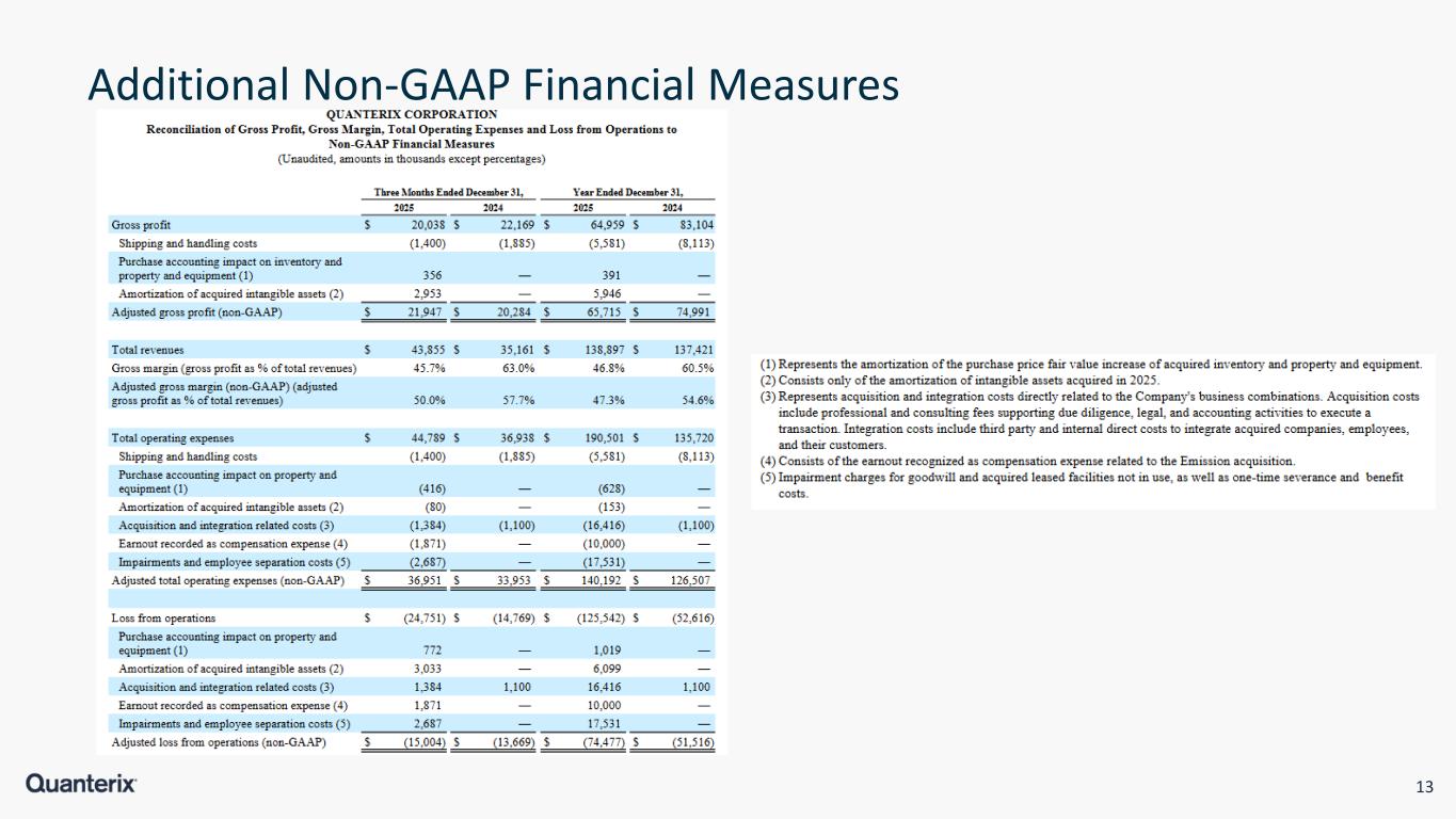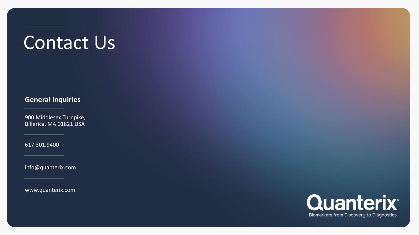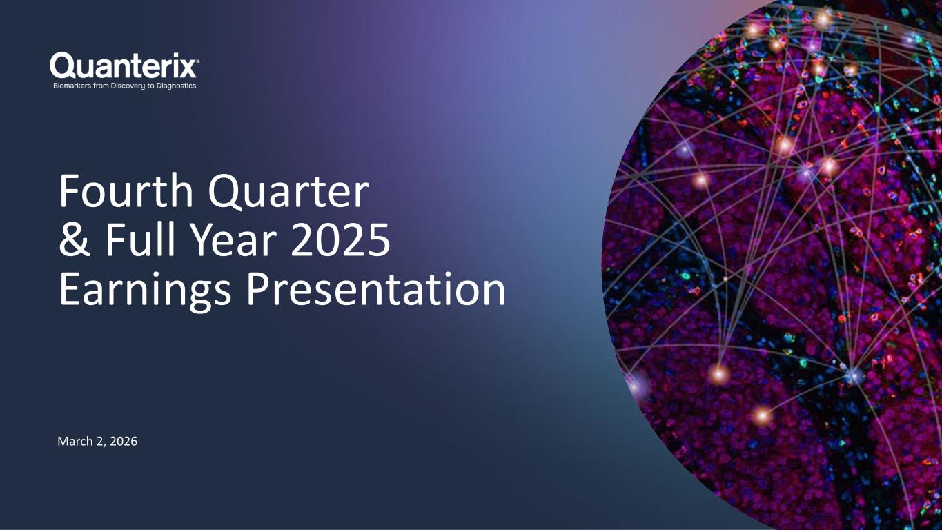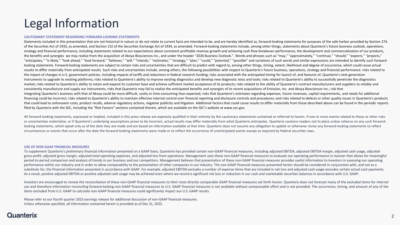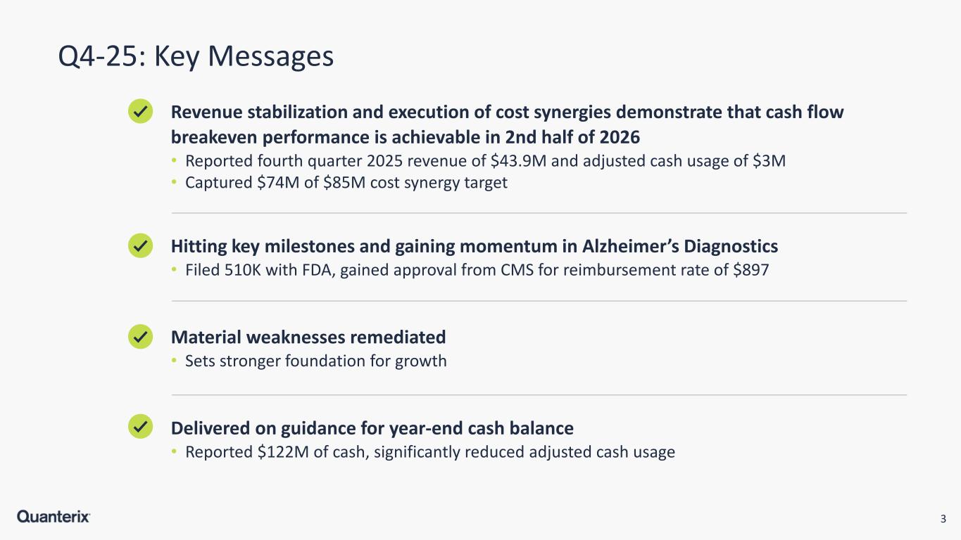 2 Legal Information USE OF NON-GAAP FINANCIAL MEASURES To supplement Quanterix's preliminary financial information presented on a GAAP basis, Quanterix has provided certain non-GAAP financial measures, including adjusted EBITDA, adjusted EBITDA margin, adjusted cash usage, adjusted gross profit, adjusted gross margin, adjusted total operating expenses, and adjusted loss from operations. Management uses these non-GAAP financial measures to evaluate our operating performance in manner that allows for meaningful period-to-period comparison and analysis of trends in our business and our competitors. Management believes that presentation of these non-GAAP financial measures provides useful information to investors in assessing our operating performance within our industry and in order to allow comparability to the presentation of other companies in our industry. The non-GAAP financial measures presented herein should be considered in conjunction with, and not as a substitute for, the financial information presented in accordance with GAAP. For example, adjusted EBITDA excludes a number of expense items that are included in net loss and adjusted cash usage excludes certain actual cash payments. As a result, positive adjusted EBITDA or positive adjusted cash usage may be achieved even where we record a significant net loss or reduction in our cash and marketable securities balances in accordance with U.S. GAAP. Investors are encouraged to review the reconciliation of these non-GAAP financial measures to their most directly comparable GAAP financial measures set forth herein. Quanterix does not forecast many of the excluded items for internal use and therefore information reconciling forward-looking non-GAAP financial measures to U.S. GAAP financial measures is not available without unreasonable effort and is not provided. The occurrence, timing, and amount of any of the items excluded from U.S. GAAP to calculate non-GAAP financial measures could significantly impact our U.S. GAAP results. Please refer to our fourth quarter 2025 earnings release for additional discussion of non-GAAP financial measures. Unless otherwise specified, all information contained herein is provided as of Dec 31, 2025. CAUTIONARY STATEMENT REGARDING FORWARD-LOOKING STATEMENTS Statements included in this presentation that are not historical in nature or do not relate to current facts are intended to be, and are hereby identified as, forward-looking statements for purposes of the safe harbor provided by Section 27A of the Securities Act of 1933, as amended, and Section 21E of the Securities Exchange Act of 1934, as amended. Forward-looking statements include, among other things, statements about Quanterix’s future business outlook, operations, strategy and financial performance, including statements related to our expectations about consistent profitable revenue growth and achieving cash flow breakeven performance, the development and commercialization of our products, the benefits and synergies we may realize from the acquisition of Akoya Biosciences Inc., and under the header “2026 Business Outlook.”. Words and phrases such as “may,” “approximately,” “continue,” “should,” “expects,” “projects,” “anticipates,” “is likely,” “look ahead,” “look forward,” “believes,” “will,” “intends,” “estimates,” “strategy,” “plan,” “could,” “potential,” “possible” and variations of such words and similar expressions are intended to identify such forward- looking statements. Forward-looking statements are subject to certain risks and uncertainties that are difficult to predict with regard to, among other things, timing, extent, likelihood and degree of occurrence, which could cause actual results to differ materially from anticipated results. Such risks and uncertainties include, among others, the following possibilities with respect to Quanterix’s future business, operations, strategy and financial performance: risks related to the impact of changes in U.S. government policies, including impacts of tariffs and reductions in federal research funding; risks associated with the anticipated timing for launch of, and features of, Quanterix’s next-generation instruments to upgrade its existing platforms; risks related to Quanterix’s ability to improve existing diagnostics and develop new diagnostic tests and tools; risks related to Quanterix’s ability to successfully penetrate the diagnostics market; risks related to Quanterix’s ability to retain and expand its customer base and achieve sufficient market acceptance of its products; risks related to the ability of Quanterix’s contract manufacturers and suppliers to reliably and consistently manufacture and supply our instruments; risks that Quanterix may fail to realize the anticipated benefits and synergies of its recent acquisitions of Emission, Inc. and Akoya Biosciences Inc.; risk that integrating Quanterix’s business with that of Akoya could be more difficult, costly or time-consuming than expected; risks that Quanterix’s estimates regarding expenses, future revenues, capital requirements, and needs for additional financing could be incorrect; risks related to Quanterix’s ability to maintain effective internal control over financial reporting and disclosure controls and procedures; and risks related to defects or other quality issues in Quanterix’s products that could lead to unforeseen costs, product recalls, adverse regulatory actions, negative publicity and litigation. Additional factors that could cause results to differ materially from those described above can be found in the periodic reports filed by Quanterix with the SEC, including the “Risk Factors” sections contained therein, which are available on the SEC’s website at www.sec.gov. All forward-looking statements, expressed or implied, included in this press release are expressly qualified in their entirety by the cautionary
