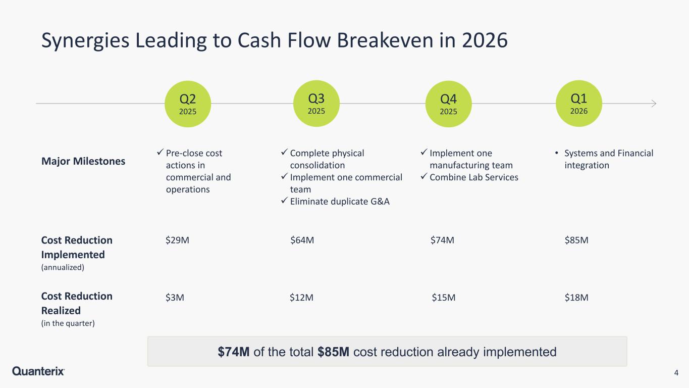 3 Q4-25: Key Messages Revenue stabilization and execution of cost synergies demonstrate that cash flow breakeven performance is achievable in 2nd half of 2026 • Reported fourth quarter 2025 revenue of $43.9M and adjusted cash usage of $3M • Captured $74M of $85M cost synergy target Hitting key milestones and gaining momentum in Alzheimer’s Diagnostics • Filed 510K with FDA, gained approval from CMS for reimbursement rate of $897 Material weaknesses remediated • Sets stronger foundation for growth Delivered on guidance for year-end cash balance • Reported $122M of cash, significantly reduced adjusted cash usage