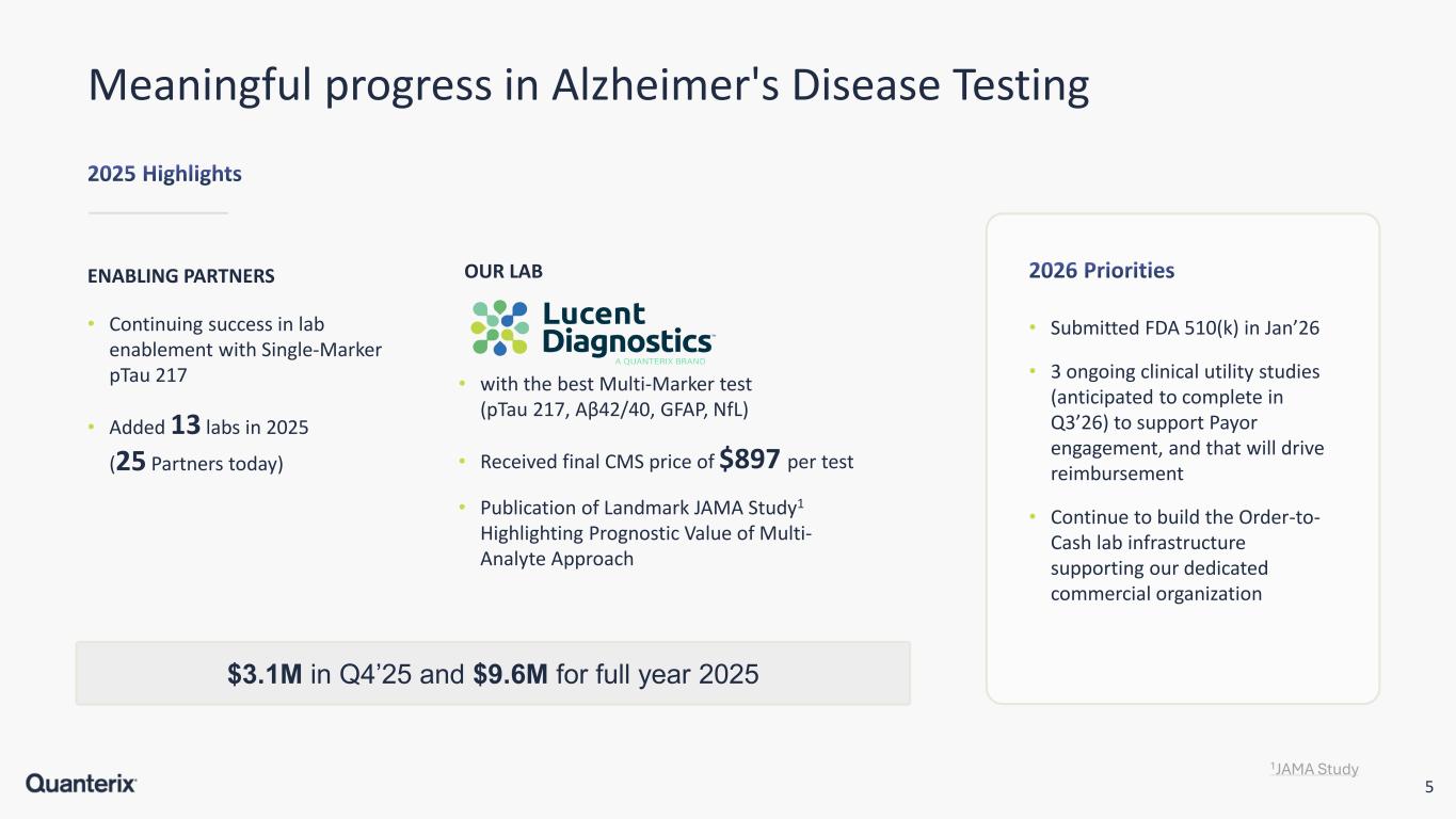 4 $74M of the total $85M cost reduction already implemented Synergies Leading to Cash Flow Breakeven in 2026 Major Milestones Cost Reduction Implemented (annualized)  Complete physical consolidation  Implement one commercial team  Eliminate duplicate G&A  Implement one manufacturing team  Combine Lab Services • Systems and Financial integration $74M $85M $29M $64M Cost Reduction Realized (in the quarter) $3M $12M  Pre-close cost actions in commercial and operations $15M $18M Q2 2025 Q3 2025 Q4 2025 Q1 2026