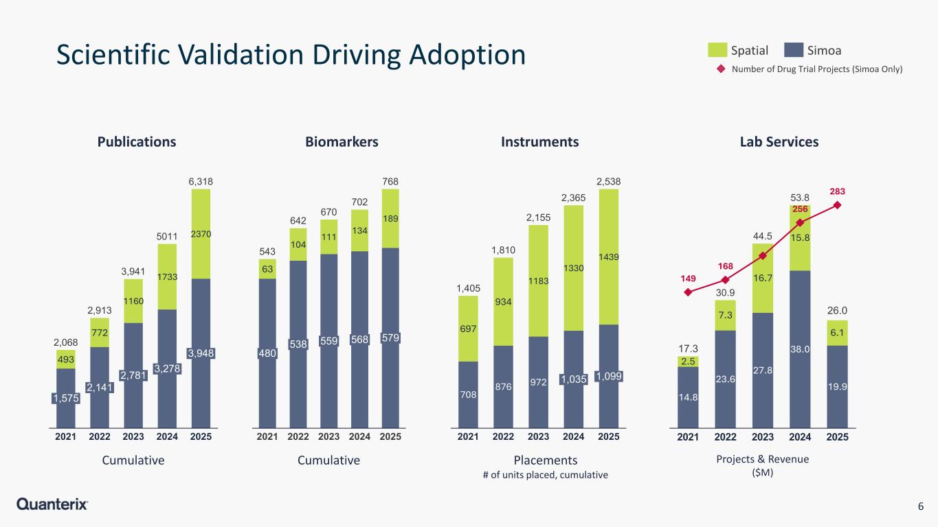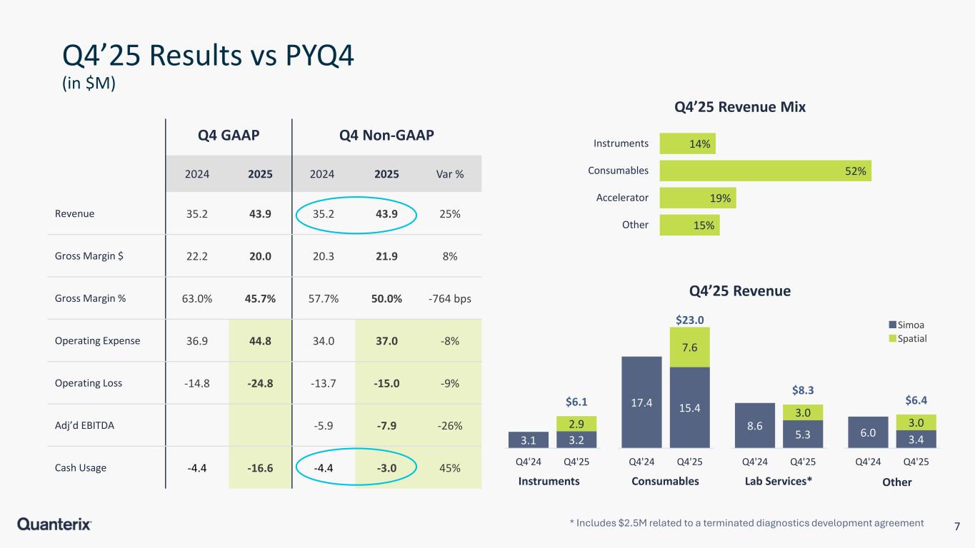 6 Scientific Validation Driving Adoption Spatial Simoa Number of Drug Trial Projects (Simoa Only) 493 772 1160 1733 2370 1,575 2021 2,141 2022 2,781 2023 3,278 2024 3,948 2025 2,068 2,913 3,941 5011 6,318 63 104 111 134 189 480 2021 538 2022 559 2023 568 2024 579 2025 543 642 670 702 768 708 876 972 697 934 1183 1330 1439 2021 2022 2023 1,035 2024 1,099 2025 1,405 1,810 2,155 2,365 2,538 14.8 23.6 27.8 38.0 19.9 2.5 7.3 16.7 15.8 6.1 149 168 256 283 2021 2022 2023 2024 2025 17.3 30.9 44.5 53.8 26.0 Publications CumulativeCumulative Projects & Revenue ($M) Placements # of units placed, cumulative Biomarkers Instruments Lab Services