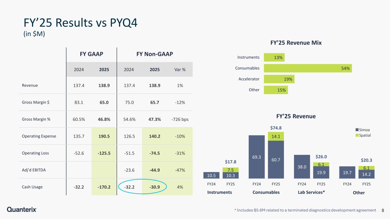 7 Q4’25 Results vs PYQ4 (in $M) Q4 GAAP Q4 Non-GAAP 2024 2025 2024 2025 Var % Revenue 35.2 43.9 35.2 43.9 25% Gross Margin $ 22.2 20.0 20.3 21.9 8% Gross Margin % 63.0% 45.7% 57.7% 50.0% -764 bps Operating Expense 36.9 44.8 34.0 37.0 -8% Operating Loss -14.8 -24.8 -13.7 -15.0 -9% Adj’d EBITDA -5.9 -7.9 -26% Cash Usage -4.4 -16.6 -4.4 -3.0 45% 14% 52% 19% 15% Instruments Consumables Accelerator Other Q4’25 Revenue Mix * Includes $2.5M related to a terminated diagnostics development agreement 3.1 3.2 2.9 $6.1 Q4'24 Q4'25 Instruments 17.4 15.4 7.6 $23.0 Q4'24 Q4'25 Consumables 8.6 5.3 3.0 $8.3 Q4'24 Q4'25 Lab Services* 6.0 3.4 3.0 $6.4 Q4'24 Q4'25 Other Q4’25 Revenue Spatial Simoa