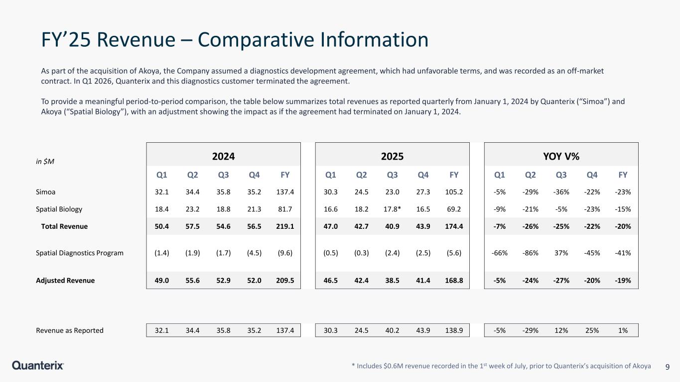 8 FY’25 Results vs PYQ4 (in $M) FY GAAP FY Non-GAAP 2024 2025 2024 2025 Var % Revenue 137.4 138.9 137.4 138.9 1% Gross Margin $ 83.1 65.0 75.0 65.7 -12% Gross Margin % 60.5% 46.8% 54.6% 47.3% -726 bps Operating Expense 135.7 190.5 126.5 140.2 -10% Operating Loss -52.6 -125.5 -51.5 -74.5 -31% Adj’d EBITDA -23.6 -44.9 -47% Cash Usage -32.2 -170.2 -32.2 -30.9 4% 13% 54% 19% 15% Instruments Consumables Accelerator Other FY’25 Revenue Mix * Includes $5.6M related to a terminated diagnostics development agreement 10.5 10.3 7.5 $17.8 FY24 FY25 Instruments 69.3 60.7 14.1 $74.8 FY24 FY25 Consumables 38.0 19.9 6.1 $26.0 FY24 FY25 Lab Services* 19.7 14.2 6.1 $20.3 FY24 FY25 Other FY’25 Revenue Spatial Simoa