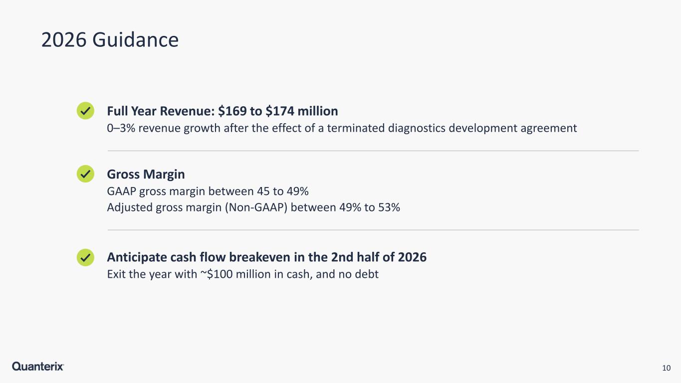 10 2026 Guidance Full Year Revenue: $169 to $174 million 0–3% revenue growth after the effect of a terminated diagnostics development agreement Gross Margin GAAP gross margin between 45 to 49% Adjusted gross margin (Non-GAAP) between 49% to 53% Anticipate cash flow breakeven in the 2nd half of 2026 Exit the year with ~$100 million in cash, and no debt