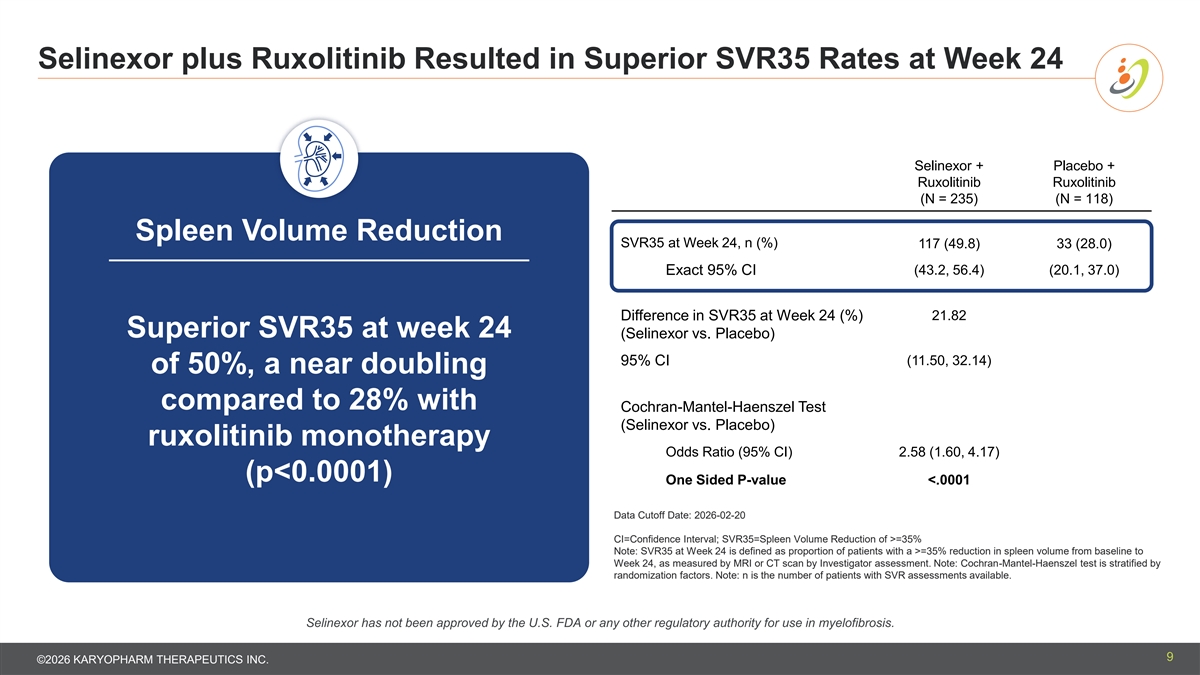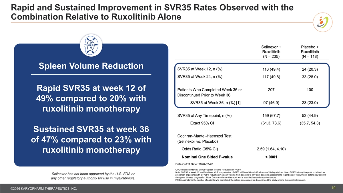 Selinexor plus Ruxolitinib Resulted in Superior SVR35 Rates at Week 24 Selinexor + Placebo + Ruxolitinib Ruxolitinib (N = 235) (N = 118) Spleen Volume Reduction SVR35 at Week 24, n (%) 117 (49.8) 33 (28.0) Exact 95% CI (43.2, 56.4) (20.1, 37.0) 21.82 Difference in SVR35 at Week 24 (%) Superior SVR35 at week 24 (Selinexor vs. Placebo) (11.50, 32.14) 95% CI of 50%, a near doubling compared to 28% with Cochran-Mantel-Haenszel Test (Selinexor vs. Placebo) ruxolitinib monotherapy Odds Ratio (95% CI) 2.58 (1.60, 4.17) (p<0.0001) One Sided P-value <.0001 Data Cutoff Date: 2026-02-20 CI=Confidence Interval; SVR35=Spleen Volume Reduction of >=35% Note: SVR35 at Week 24 is defined as proportion of patients with a >=35% reduction in spleen volume from baseline to Week 24, as measured by MRI or CT scan by Investigator assessment. Note: Cochran-Mantel-Haenszel test is stratified by randomization factors. Note: n is the number of patients with SVR assessments available. Selinexor has not been approved by the U.S. FDA or any other regulatory authority for use in myelofibrosis. 9 ©2026 KARYOPHARM THERAPEUTICS INC.