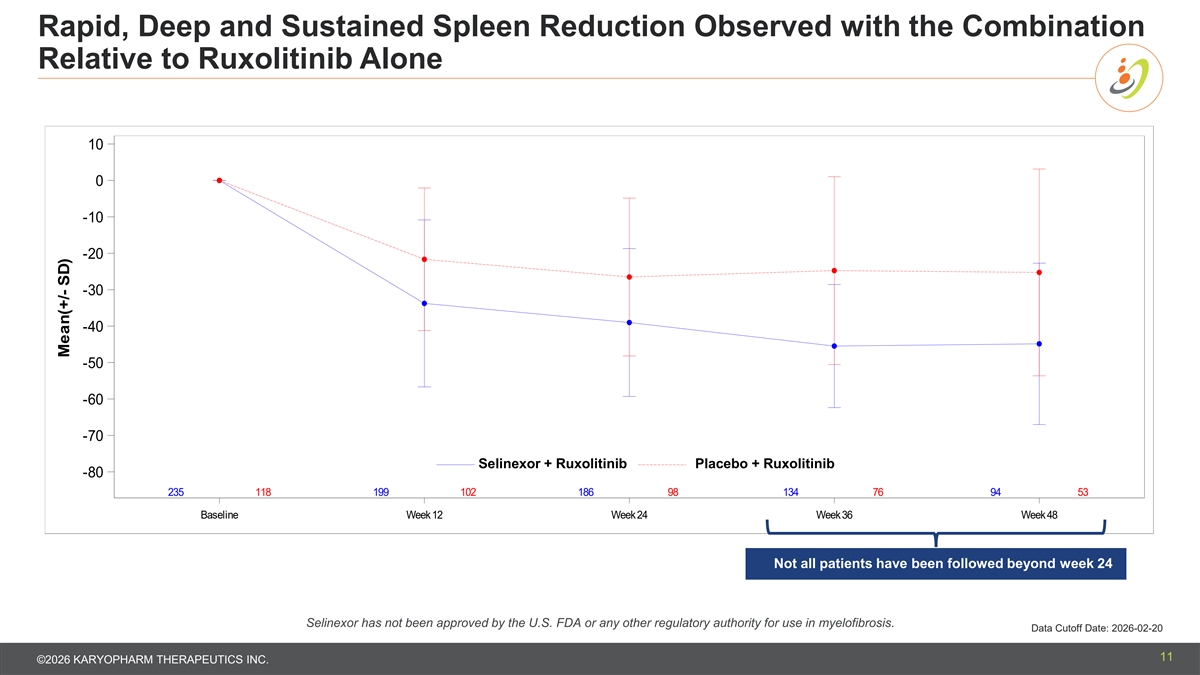 Rapid and Sustained Improvement in SVR35 Rates Observed with the Combination Relative to Ruxolitinib Alone Selinexor + Placebo + Ruxolitinib Ruxolitinib (N = 235) (N = 118) Spleen Volume Reduction SVR35 at Week 12, n (%) 116 (49.4) 24 (20.3) SVR35 at Week 24, n (%) 117 (49.8) 33 (28.0) Rapid SVR35 at week 12 of Patients Who Completed Week 36 or 207 100 Discontinued Prior to Week 36 49% compared to 20% with SVR35 at Week 36, n (%) [1] 97 (46.9) 23 (23.0) ruxolitinib monotherapy SVR35 at Any Timepoint, n (%) 159 (67.7) 53 (44.9) Exact 95% CI (61.3, 73.6) (35.7, 54.3) Sustained SVR35 at week 36 Cochran-Mantel-Haenszel Test of 47% compared to 23% with (Selinexor vs. Placebo) Odds Ratio (95% CI) 2.59 (1.64, 4.10) ruxolitinib monotherapy Nominal One Sided P-value <.0001 Data Cutoff Date: 2026-02-20 CI=Confidence Interval; SVR35=Spleen Volume Reduction of >=35% Note: SVR35 at Week 12 and 24 allows +/- 21-day window. SVR35 at Week 36 and 48 allows +/- 28-day window. Note: SVR35 at any timepoint is defined as Selinexor has not been approved by the U.S. FDA or proportion of patients with a >=35% reduction in spleen volume from baseline to any post-baseline assessments regardless of visit window before new anti-MF therapy or disease progression. Note: Cochran-Mantel-Haenszel test is stratified by randomization factors. any other regulatory authority for use in myelofibrosis. [1] Denominator is the number of patients who completed the spleen assessment or discontinued the study prior to the specific timepoint. 10 ©2026 KARYOPHARM THERAPEUTICS INC.