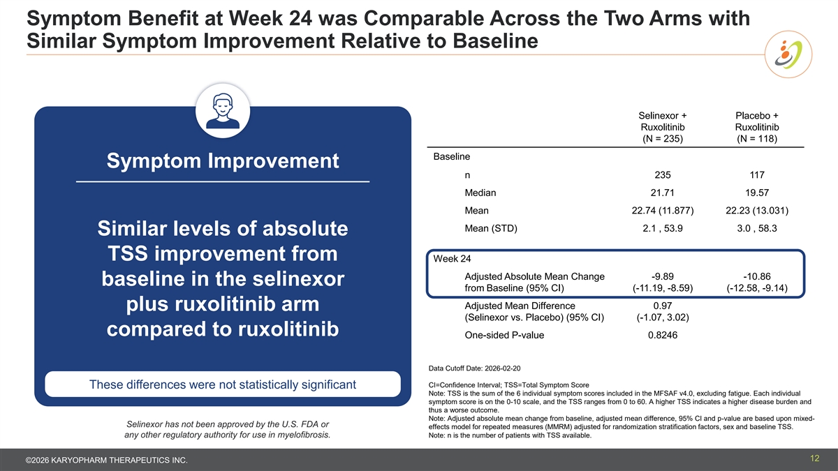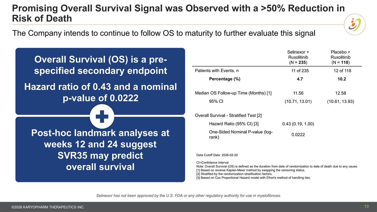 Symptom Benefit at Week 24 was Comparable Across the Two Arms with Similar Symptom Improvement Relative to Baseline Selinexor + Placebo + Ruxolitinib Ruxolitinib (N = 235) (N = 118) Baseline Symptom Improvement n 235 117 Median 21.71 19.57 Mean 22.74 (11.877) 22.23 (13.031) Mean (STD) 2.1 , 53.9 3.0 , 58.3 Similar levels of absolute TSS improvement from Week 24 Adjusted Absolute Mean Change -9.89 -10.86 baseline in the selinexor from Baseline (95% CI) (-11.19, -8.59) (-12.58, -9.14) Adjusted Mean Difference 0.97 plus ruxolitinib arm (Selinexor vs. Placebo) (95% CI) (-1.07, 3.02) compared to ruxolitinib One-sided P-value 0.8246 Data Cutoff Date: 2026-02-20 CI=Confidence Interval; TSS=Total Symptom Score These differences were not statistically significant Note: TSS is the sum of the 6 individual symptom scores included in the MFSAF v4.0, excluding fatigue. Each individual symptom score is on the 0-10 scale, and the TSS ranges from 0 to 60. A higher TSS indicates a higher disease burden and thus a worse outcome. Note: Adjusted absolute mean change from baseline, adjusted mean difference, 95% CI and p-value are based upon mixed- Selinexor has not been approved by the U.S. FDA or effects model for repeated measures (MMRM) adjusted for randomization stratification factors, sex and baseline TSS. any other regulatory authority for use in myelofibrosis. Note: n is the number of patients with TSS available. 12 ©2026 KARYOPHARM THERAPEUTICS INC.