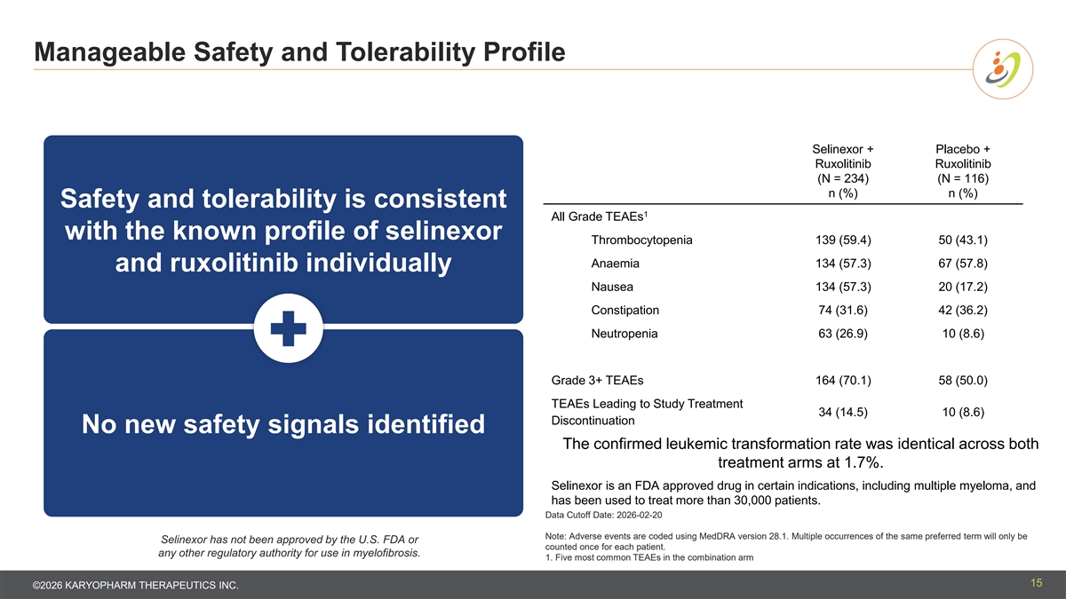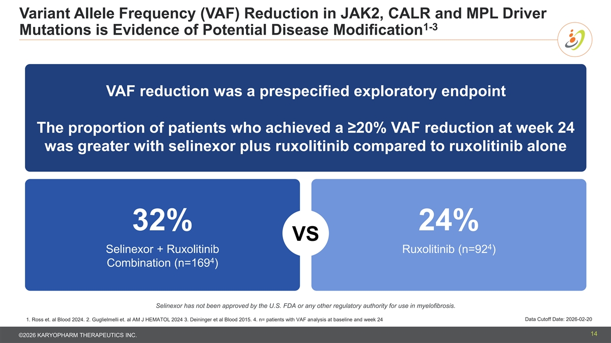 Promising Overall Survival Signal was Observed with a >50% Reduction in Risk of Death The Company intends to continue to follow OS to maturity to further evaluate this signal Selinexor + Placebo + Ruxolitinib Ruxolitinib Overall Survival (OS) is a pre- (N = 235) (N = 118) Patients with Events, n 11 of 235 12 of 118 specified secondary endpoint Percentage (%) 4.7 10.2 Hazard ratio of 0.43 and a nominal Median OS Follow-up Time (Months) [1] 11.56 12.58 p-value of 0.0222 95% CI (10.71, 13.01) (10.61, 13.93) Overall Survival - Stratified Test [2] Hazard Ratio (95% CI) [3] 0.43 (0.19, 1.00) One-Sided Nominal P-value (log- Post-hoc landmark analyses at 0.0222 rank) weeks 12 and 24 suggest Data Cutoff Date: 2026-02-20 SVR35 may predict CI=Confidence Interval Note: Overall Survival (OS) is defined as the duration from date of randomization to date of death due to any cause. overall survival [1] Based on reverse Kaplan-Meier method by swapping the censoring status. [2] Stratified by the randomization stratification factors. [3] Based on Cox Proportional Hazard model with Efron's method of handling ties. Selinexor has not been approved by the U.S. FDA or any other regulatory authority for use in myelofibrosis. 13 ©2026 KARYOPHARM THERAPEUTICS INC.