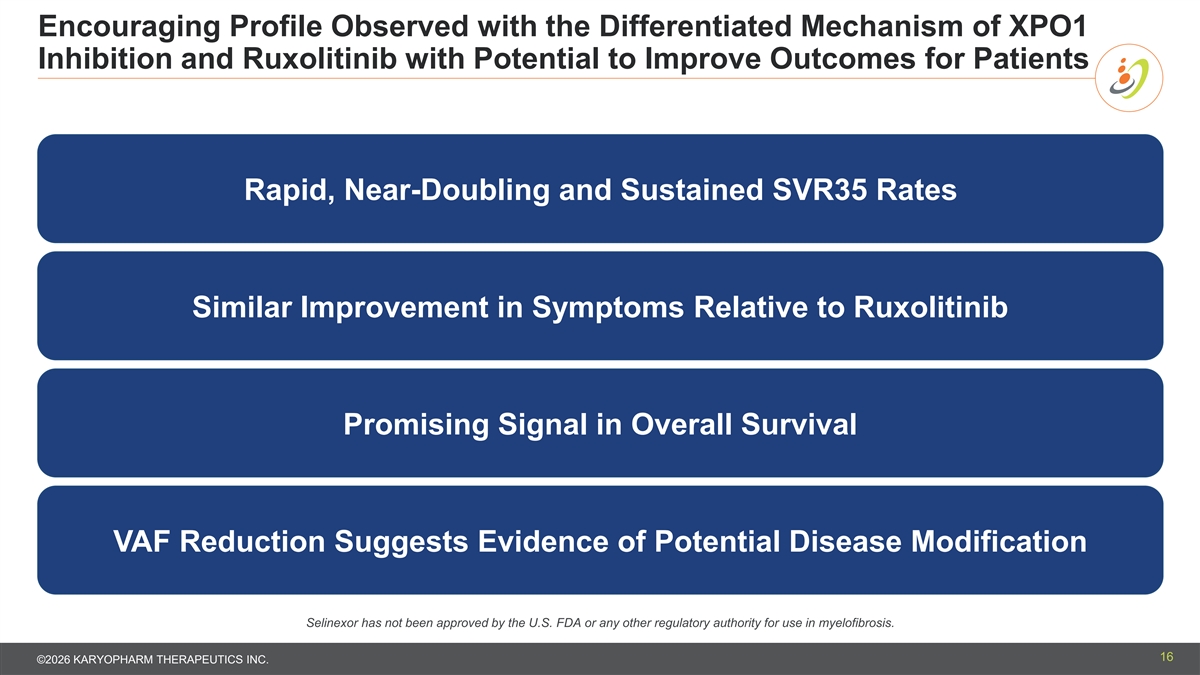 Manageable Safety and Tolerability Profile Selinexor + Placebo + Ruxolitinib Ruxolitinib (N = 234) (N = 116) n (%) n (%) Safety and tolerability is consistent 1 All Grade TEAEs with the known profile of selinexor Thrombocytopenia 139 (59.4) 50 (43.1) Anaemia 134 (57.3) 67 (57.8) and ruxolitinib individually Nausea 134 (57.3) 20 (17.2) Constipation 74 (31.6) 42 (36.2) Neutropenia 63 (26.9) 10 (8.6) Grade 3+ TEAEs 164 (70.1) 58 (50.0) TEAEs Leading to Study Treatment 34 (14.5) 10 (8.6) Discontinuation No new safety signals identified The confirmed leukemic transformation rate was identical across both treatment arms at 1.7%. Selinexor is an FDA approved drug in certain indications, including multiple myeloma, and has been used to treat more than 30,000 patients. Data Cutoff Date: 2026-02-20 Note: Adverse events are coded using MedDRA version 28.1. Multiple occurrences of the same preferred term will only be Selinexor has not been approved by the U.S. FDA or counted once for each patient. any other regulatory authority for use in myelofibrosis. 1. Five most common TEAEs in the combination arm 15 ©2026 KARYOPHARM THERAPEUTICS INC.