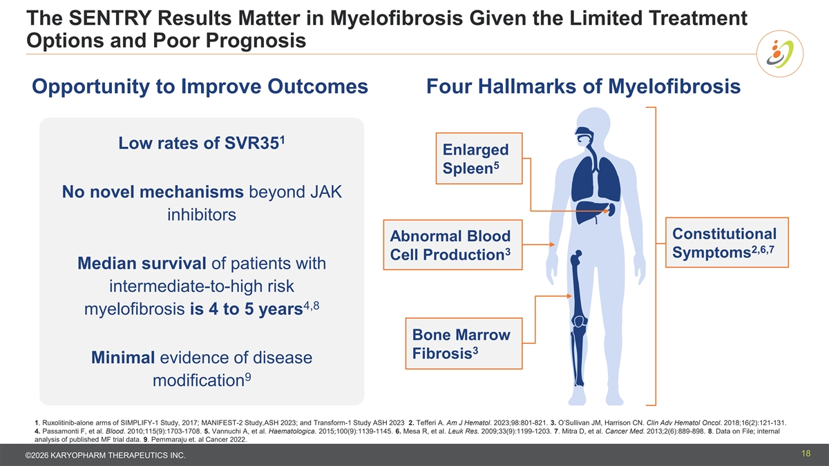The SENTRY Results Matter in Myelofibrosis Given the Limited Treatment Options and Poor Prognosis Opportunity to Improve Outcomes Four Hallmarks of Myelofibrosis 1 Low rates of SVR35 Enlarged 5 Spleen No novel mechanisms beyond JAK inhibitors Constitutional Abnormal Blood 2,6,7 3 Symptoms Cell Production Median survival of patients with intermediate-to-high risk 4,8 myelofibrosis is 4 to 5 years Bone Marrow 3 Fibrosis Minimal evidence of disease 9 modification 1. Ruxolitinib-alone arms of SIMPLIFY-1 Study, 2017; MANIFEST-2 Study,ASH 2023; and Transform-1 Study ASH 2023 2. Tefferi A. Am J Hematol. 2023;98:801-821. 3. O’Sullivan JM, Harrison CN. Clin Adv Hematol Oncol. 2018;16(2):121-131. 4. Passamonti F, et al. Blood. 2010;115(9):1703-1708. 5. Vannuchi A, et al. Haematologica. 2015;100(9):1139-1145. 6. Mesa R, et al. Leuk Res. 2009;33(9):1199-1203. 7. Mitra D, et al. Cancer Med. 2013;2(6):889-898. 8. Data on File; internal analysis of published MF trial data. 9. Pemmaraju et. al Cancer 2022. 18 ©2026 KARYOPHARM THERAPEUTICS INC.