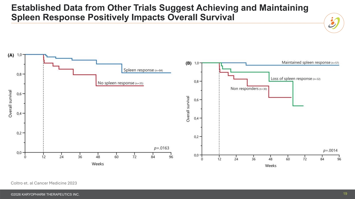 Established Data from Other Trials Suggest Achieving and Maintaining Spleen Response Positively Impacts Overall Survival Coltro et. al Cancer Medicine 2023 19 ©2026 KARYOPHARM THERAPEUTICS INC.