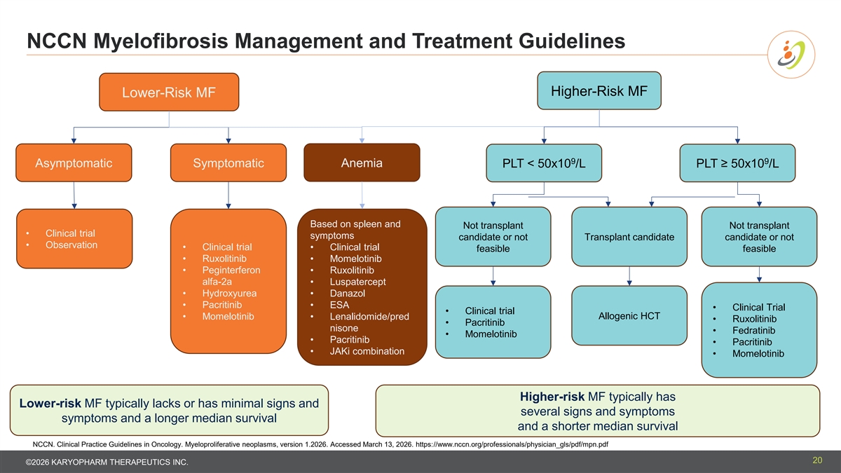 NCCN Myelofibrosis Management and Treatment Guidelines Higher-Risk MF Lower-Risk MF 9 9 Asymptomatic Symptomatic Anemia PLT < 50x10 /L PLT ≥ 50x10 /L Based on spleen and Not transplant Not transplant • Clinical trial symptoms candidate or not Transplant candidate candidate or not • Observation • Clinical trial • Clinical trial feasible feasible • Ruxolitinib • Momelotinib • Peginterferon • Ruxolitinib alfa-2a • Luspatercept • Hydroxyurea • Danazol • Pacritinib • ESA • Clinical Trial • Clinical trial • Momelotinib • Lenalidomide/pred Allogenic HCT • Ruxolitinib • Pacritinib nisone • Fedratinib • Momelotinib • Pacritinib • Pacritinib • JAKi combination • Momelotinib Higher-risk MF typically has Lower-risk MF typically lacks or has minimal signs and several signs and symptoms symptoms and a longer median survival and a shorter median survival NCCN. Clinical Practice Guidelines in Oncology. Myeloproliferative neoplasms, version 1.2026. Accessed March 13, 2026. https://www.nccn.org/professionals/physician_gls/pdf/mpn.pdf 20 ©2026 KARYOPHARM THERAPEUTICS INC.