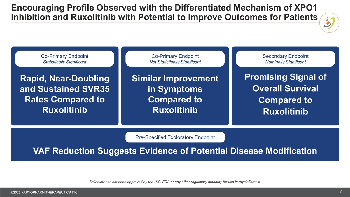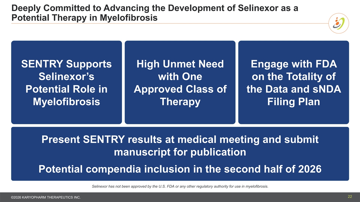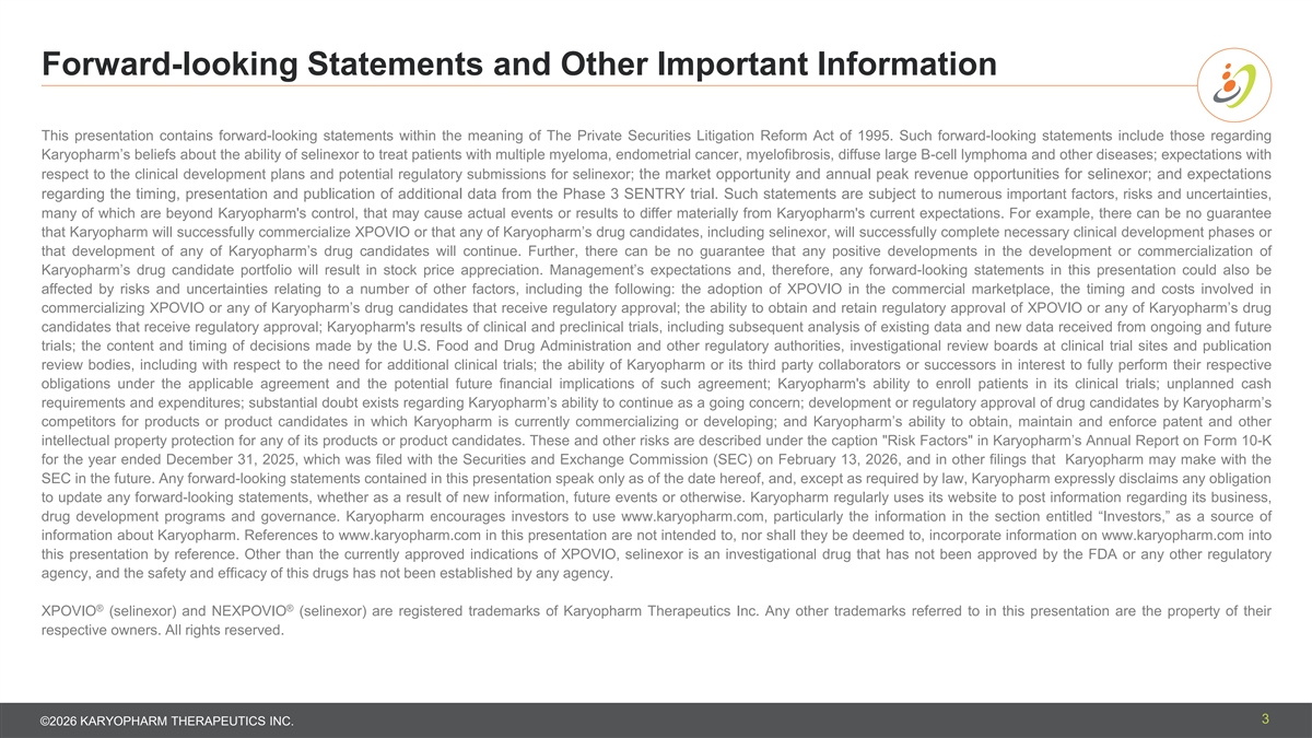 Forward-looking Statements and Other Important Information This presentation contains forward-looking statements within the meaning of The Private Securities Litigation Reform Act of 1995. Such forward-looking statements include those regarding Karyopharm’s beliefs about the ability of selinexor to treat patients with multiple myeloma, endometrial cancer, myelofibrosis, diffuse large B-cell lymphoma and other diseases; expectations with respect to the clinical development plans and potential regulatory submissions for selinexor; the market opportunity and annual peak revenue opportunities for selinexor; and expectations regarding the timing, presentation and publication of additional data from the Phase 3 SENTRY trial. Such statements are subject to numerous important factors, risks and uncertainties, many of which are beyond Karyopharm's control, that may cause actual events or results to differ materially from Karyopharm's current expectations. For example, there can be no guarantee that Karyopharm will successfully commercialize XPOVIO or that any of Karyopharm’s drug candidates, including selinexor, will successfully complete necessary clinical development phases or that development of any of Karyopharm’s drug candidates will continue. Further, there can be no guarantee that any positive developments in the development or commercialization of Karyopharm’s drug candidate portfolio will result in stock price appreciation. Management’s expectations and, therefore, any forward-looking statements in this presentation could also be affected by risks and uncertainties relating to a number of other factors, including the following: the adoption of XPOVIO in the commercial marketplace, the timing and costs involved in commercializing XPOVIO or any of Karyopharm’s drug candidates that receive regulatory approval; the ability to obtain and retain regulatory approval of XPOVIO or any of Karyopharm’s drug candidates that receive regulatory approval; Karyopharm's results of clinical and preclinical trials, including subsequent analysis of existing data and new data received from ongoing and future trials; the content and timing of decisions made by the U.S. Food and Drug Administration and other regulatory authorities, investigational review boards at clinical trial sites and publication review bodies, including with respect to the need for additional clinical trials; the ability of Karyopharm or its third party collaborators or successors in interest to fully perform their respective obligations under the applicable agreement and the potential future financial implications of such agreement; Karyopharm's ability to enroll patients in its clinical trials; unplanned cash requirements and expenditures; substantial doubt exists regarding Karyopharm’s ability to continue as a going concern; development or regulatory approval of drug candidates by Karyopharm’s competitors for products or product candidates in which Karyopharm is currently commercializing or developing; and Karyopharm’s ability to obtain, maintain and enforce patent and other intellectual property protection for any of its products or product candidates. These and other risks are described under the caption Risk Factors in Karyopharm’s Annual Report on Form 10-K for the year ended December 31, 2025, which was filed with the Securities and Exchange Commission (SEC) on February 13, 2026, and in other filings that Karyopharm may make with the SEC in the future. Any forward-looking statements contained in this presentation speak only as of the date hereof, and, except as required by law, Karyopharm expressly disclaims any obligation to update any forward-looking statements, whether as a result of new information, future events or otherwise. Karyopharm regularly uses its website to post information regarding its business, drug development programs and governance. Karyopharm encourages investors to use www.karyopharm.com, particularly the information in the section entitled “Investors,” as a source of information about Karyopharm. References to www.karyopharm.com in this presentation are not intended to, nor shall they be deemed to, incorporate information on www.karyopharm.com into this presentation by reference. Other than the currently approved indications of XPOVIO, selinexor is an investigational drug that has not been approved by the FDA or any other regulatory agency, and the safety and efficacy of this drugs has not been established by any agency. ® ® XPOVIO (selinexor) and NEXPOVIO (selinexor) are registered trademarks of Karyopharm Therapeutics Inc. Any other trademarks referred to in this presentation are the property of their respective owners. All rights reserved. 3 ©2026 KARYOPHARM THERAPEUTICS INC.