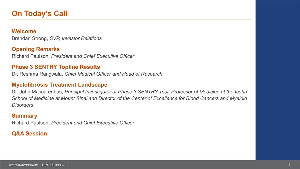 On Today’s Call Welcome Brendan Strong, SVP, Investor Relations Opening Remarks Richard Paulson, President and Chief Executive Officer Phase 3 SENTRY Topline Results Dr. Reshma Rangwala, Chief Medical Officer and Head of Research Myelofibrosis Treatment Landscape Dr. John Mascarenhas, Principal Investigator of Phase 3 SENTRY Trial; Professor of Medicine at the Icahn School of Medicine at Mount Sinai and Director of the Center of Excellence for Blood Cancers and Myeloid Disorders Summary Richard Paulson, President and Chief Executive Officer Q&A Session 2 ©2026 KARYOPHARM THERAPEUTICS INC.