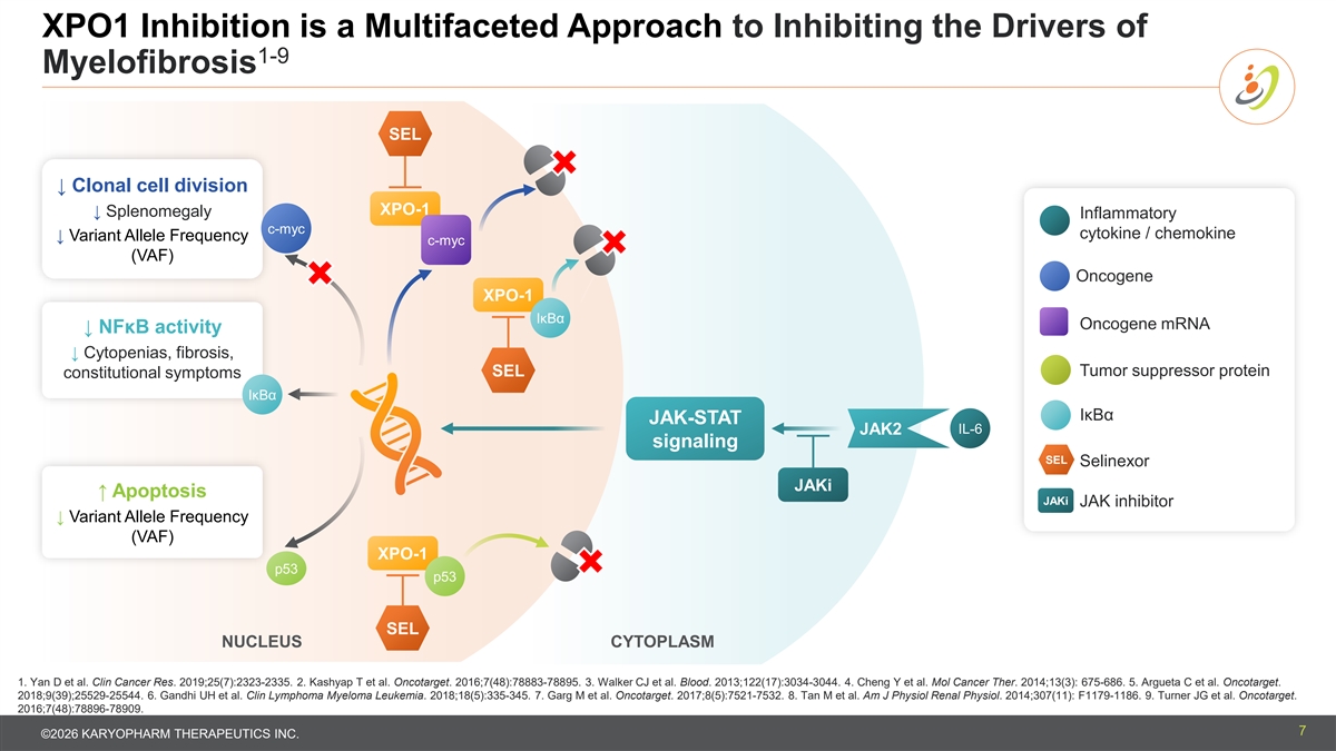 XPO1 Inhibition is a Multifaceted Approach to Inhibiting the Drivers of 1-9 Myelofibrosis SEL ↓ Clonal cell division XPO-1 ↓ Splenomegaly Inflammatory c-myc cytokine / chemokine ↓ Variant Allele Frequency c-myc (VAF) Oncogene XPO-1 IκBα Oncogene mRNA ↓ NFκB activity ↓ Cytopenias, fibrosis, SEL Tumor suppressor protein constitutional symptoms IκBα IκBα JAK-STAT IL-6 JAK2 signaling SEL Selinexor JAKi ↑ Apoptosis JAKi JAK inhibitor ↓ Variant Allele Frequency (VAF) XPO-1 p53 p53 SEL NUCLEUS CYTOPLASM 1. Yan D et al. Clin Cancer Res. 2019;25(7):2323-2335. 2. Kashyap T et al. Oncotarget. 2016;7(48):78883-78895. 3. Walker CJ et al. Blood. 2013;122(17):3034-3044. 4. Cheng Y et al. Mol Cancer Ther. 2014;13(3): 675-686. 5. Argueta C et al. Oncotarget. 2018;9(39);25529-25544. 6. Gandhi UH et al. Clin Lymphoma Myeloma Leukemia. 2018;18(5):335-345. 7. Garg M et al. Oncotarget. 2017;8(5):7521-7532. 8. Tan M et al. Am J Physiol Renal Physiol. 2014;307(11): F1179-1186. 9. Turner JG et al. Oncotarget. 2016;7(48):78896-78909. 7 ©2026 KARYOPHARM THERAPEUTICS INC.