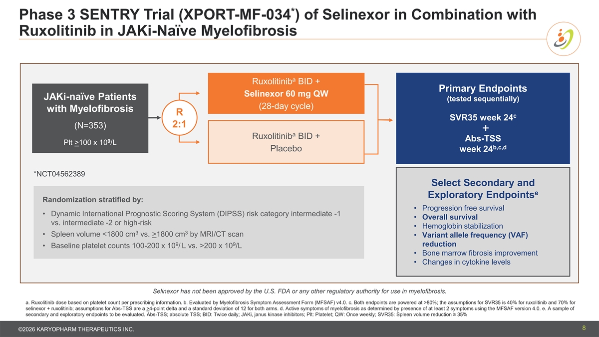 * Phase 3 SENTRY Trial (XPORT-MF-034 ) of Selinexor in Combination with Ruxolitinib in JAKi-Naïve Myelofibrosis a Ruxolitinib BID + Primary Endpoints Selinexor 60 mg QW JAKi-naïve Patients (tested sequentially) (28-day cycle) with Myelofibrosis R c SVR35 week 24 2:1 (N=353) + a Ruxolitinib BID + Abs-TSS 9 Plt >100 x 10 /L b,c,d Placebo week 24 *NCT04562389 Select Secondary and e Exploratory Endpoints Randomization stratified by: • Progression free survival • Dynamic International Prognostic Scoring System (DIPSS) risk category intermediate -1 • Overall survival vs. intermediate -2 or high-risk • Hemoglobin stabilization 3 3 • Spleen volume <1800 cm vs. >1800 cm by MRI/CT scan • Variant allele frequency (VAF) 9 9 reduction • Baseline platelet counts 100-200 x 10 / L vs. >200 x 10 /L • Bone marrow fibrosis improvement • Changes in cytokine levels Selinexor has not been approved by the U.S. FDA or any other regulatory authority for use in myelofibrosis. a. Ruxolitinib dose based on platelet count per prescribing information. b. Evaluated by Myelofibrosis Symptom Assessment Form (MFSAF) v4.0. c. Both endpoints are powered at >80%; the assumptions for SVR35 is 40% for ruxolitinib and 70% for selinexor + ruxolitinib; assumptions for Abs-TSS are a >4-point delta and a standard deviation of 12 for both arms. d. Active symptoms of myelofibrosis as determined by presence of at least 2 symptoms using the MFSAF version 4.0. e. A sample of secondary and exploratory endpoints to be evaluated. Abs-TSS; absolute TSS; BID: Twice daily; JAKi, janus kinase inhibitors; Plt: Platelet; QW: Once weekly; SVR35: Spleen volume reduction ≥ 35% 8 ©2026 KARYOPHARM THERAPEUTICS INC.