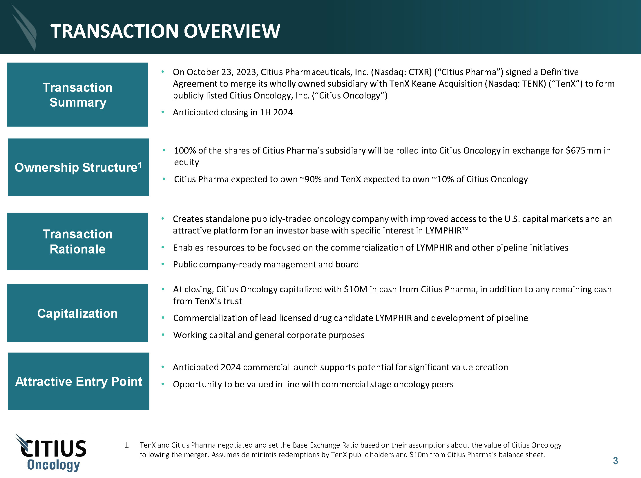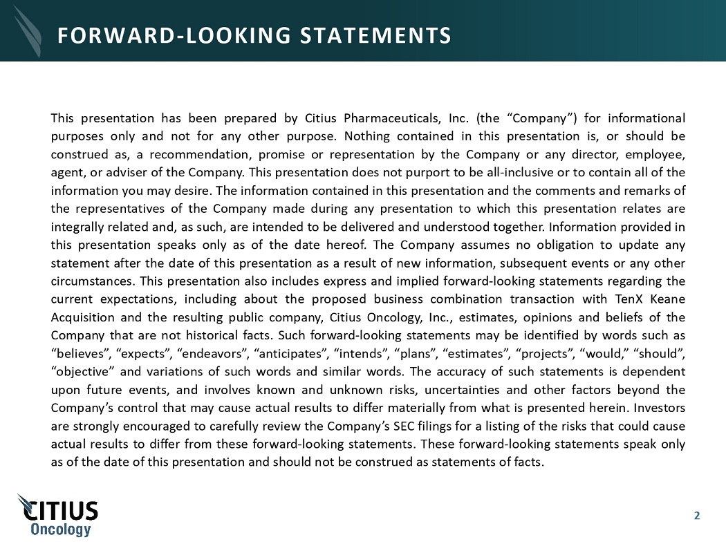 2 This presentation has been prepared by Citius Pharmaceuticals, Inc . (the “Company”) for informational purposes only and not for any other purpose . Nothing contained in this presentation is, or should be construed as, a recommendation, promise or representation by the Company or any director, employee, agent, or adviser of the Company . This presentation does not purport to be all - inclusive or to contain all of the information you may desire . The information contained in this presentation and the comments and remarks of the representatives of the Company made during any presentation to which this presentation relates are integrally related and, as such, are intended to be delivered and understood together . Information provided in this presentation speaks only as of the date hereof . The Company assumes no obligation to update any statement after the date of this presentation as a result of new information, subsequent events or any other circumstances . This presentation also includes express and implied forward - looking statements regarding the current expectations, including about the proposed business combination transaction with TenX Keane Acquisition and the resulting public company, Citius Oncology, Inc . , estimates, opinions and beliefs of the Company that are not historical facts . Such forward - looking statements may be identified by words such as “believes”, “expects”, “endeavors”, “anticipates”, “intends”, “plans”, “estimates”, “projects”, “would,” “should”, “objective” and variations of such words and similar words . The accuracy of such statements is dependent upon future events, and involves known and unknown risks, uncertainties and other factors beyond the Company’s control that may cause actual results to differ materially from what is presented herein . Investors are strongly encouraged to carefully review the Company’s SEC filings for a listing of the risks that could cause actual results to differ from these forward - looking statements . These forward - looking statements speak only as of the date of this presentation and should not be construed as statements of facts . FORWARD - LOOKING STATEMENTS