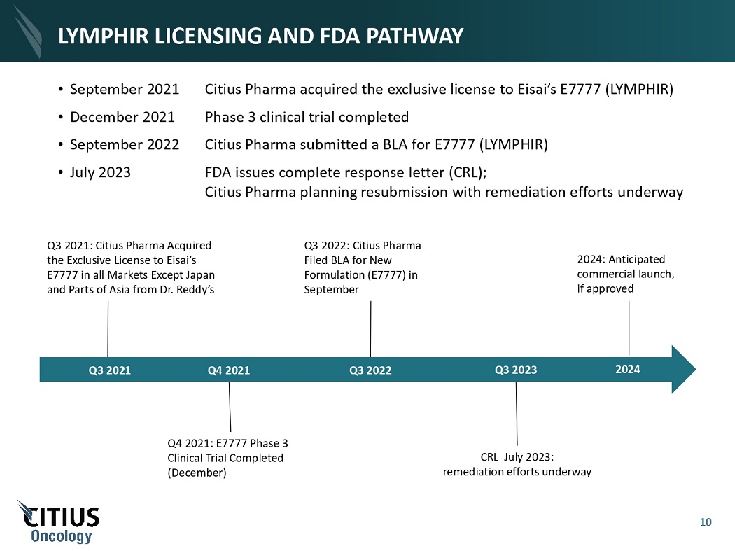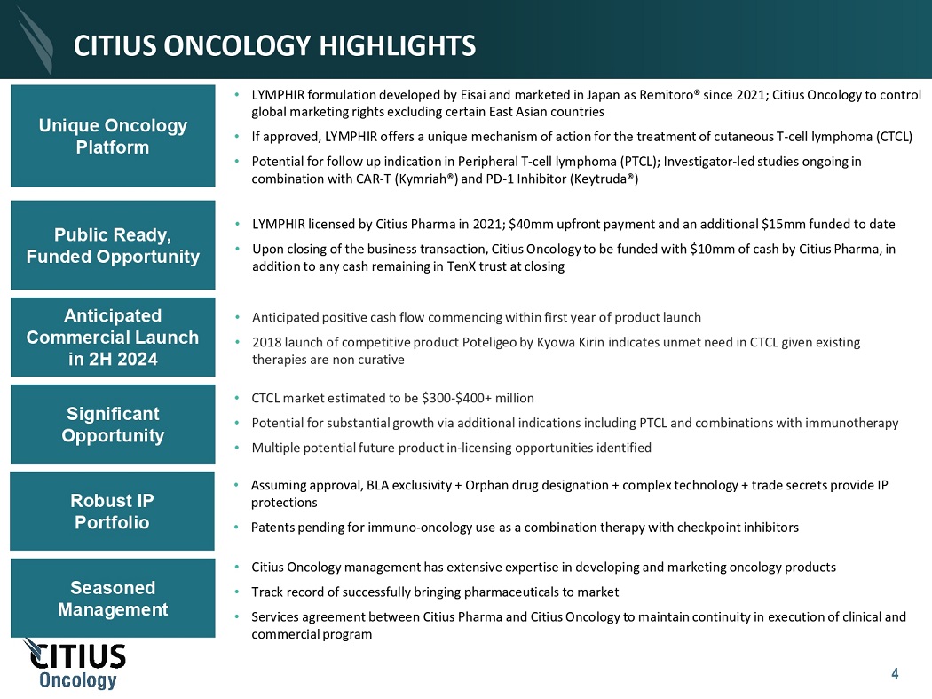 TRANSACTION OVERVIEW Ownership Structure 1 • 100% of the shares of Citius Pharma’s subsidiary will be rolled into Citius Oncology in exchange for $675mm in equity • Citius Pharma expected to own ~90% and TenX expected to own ~10% of Citius Oncology T r a n sac t i o n Rationale • Creates standalone publicly - traded oncology company with improved access to the U.S. capital markets and an attractive platform for an investor base with specific interest in LYMPHIR Ρ • Enables resources to be focused on the commercialization of LYMPHIR and other pipeline initiatives • Public company - ready management and board • Citius Pharmaceuticals, Inc. (Nasdaq: CTXR) (“Citius Pharma”) signed a Definitive Agreement to merge its wholly owned subsidiary with TenX Keane Acquisition (Nasdaq: TENK) (“TenX”) to form publicly listed Citius Oncology, Inc. (“Citius Oncology”) on October 23, 2023 • Anticipated closing in 1H 2024 T r a n sac t i o n Summary Capitalization • At closing, Citius Oncology capitalized with $10M in cash from Citius Pharma, in addition to any remaining cash from TenX’s trust • Commercialization of lead licensed drug candidate LYMPHIR and development of pipeline • Working capital and general corporate purposes Attractive Entry Point • Anticipated 2024 commercial launch supports potential for significant value creation • Opportunity to be valued in line with commercial stage oncology peers 1. TenX and Citius Pharma negotiated and set the Base Exchange Ratio based on their assumptions about the value of Citius Oncology following the merger. Assumes de minimis redemptions by TenX public holders and $10m from Citius Pharma’s balance sheet. 3