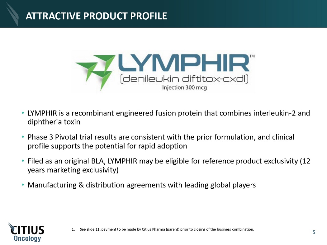 CITIUS ONCOLOGY HIGHLIGHTS Public Ready, Funded Opportunity Anticipated Commercial Launch in 2H 2024 Significant O ppo r t un i ty Robust IP Portfolio Seasoned M a n a g e me nt • LYMPHIR licensed by Citius Pharma in 2021; $40mm upfront payment and an additional $15mm funded to date • Upon closing of the business transaction, Citius Oncology to be funded with $10mm of cash by Citius Pharma, in addition to any cash remaining in TenX trust at closing • Anticipated positive cash flow commencing within first year of product launch • 2018 launch of competitive product Poteligeo by Kyowa Kirin indicates unmet need in CTCL given existing therapies are non curative • CTCL market estimated to be $300 - $400+ million • Potential for substantial growth via additional indications including PTCL and combinations with immunotherapy • Multiple potential future product in - licensing opportunities identified • Assuming approval, BLA exclusivity + Orphan drug designation + complex technology + trade secrets provide IP protections • Patents pending for immuno - oncology use as a combination therapy with checkpoint inhibitors • Citius Oncology management has extensive expertise in developing and marketing oncology products • Track record of successfully bringing pharmaceuticals to market • Services agreement between Citius Pharma and Citius Oncology to maintain continuity in execution of clinical and commercial program 4 • LYMPHIR formulation developed by Eisai and marketed in Japan as Remitoro® since 2021; Citius Oncology to control global marketing rights excluding certain East Asian countries • If approved, LYMPHIR offers a unique mechanism of action for the treatment of cutaneous T - cell lymphoma (CTCL) • Potential for follow up indication in Peripheral T - cell lymphoma (PTCL); Investigator - led studies ongoing in combination with CAR - T (Kymriah®) and PD - 1 Inhibitor (Keytruda®) Unique Oncology Platform