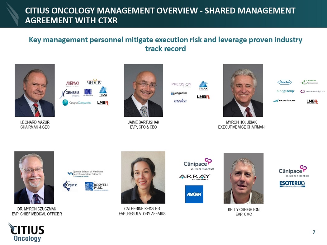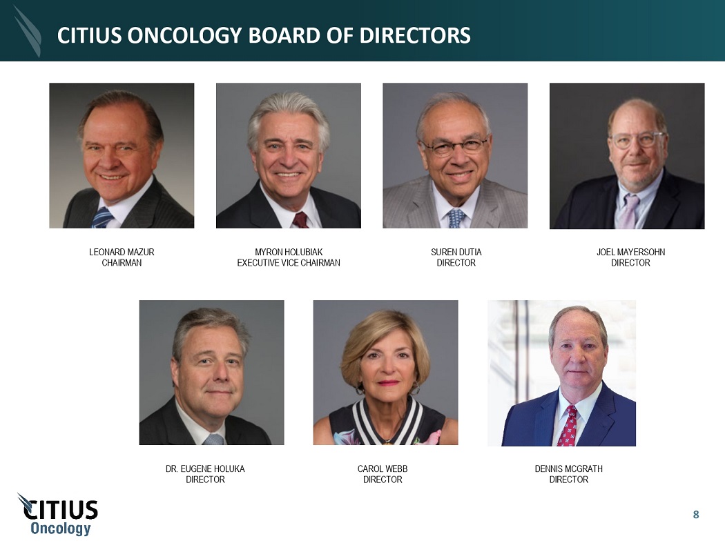 CITIUS ONCOLOGY MANAGEMENT OVERVIEW - SHARED MANAGEMENT AGREEMENT WITH CTXR L E O NA R D M A Z UR CHA I RM A N & CE O J A I M E BA R T U S H AK EVP, C F O & C BO DR . M YR O N C Z UC Z M A N EVP, CH I EF M E D I C AL O FF I C ER KE LL Y CRE I G H T O N EVP, C M C CA T HE RI N E KESS L ER EVP, R EG U L A T O R Y A FF A I R S Key management personnel mitigate execution risk and leverage proven industry track record M YR O N H O L UB I A K EXE CU T I VE V I C E CH A I R M AN 7