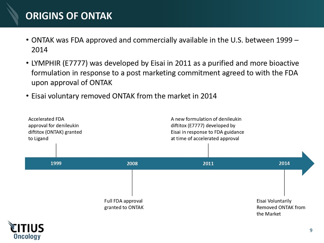 CITIUS ONCOLOGY BOARD OF DIRECTORS L E O NA R D M A Z UR CHAIRMAN M YR O N H O L UB I A K EXE CU T I VE V I C E CH A I R M AN 8 S UREN DU T I A DIRECTOR J O E L M AYE R SO H N DIRECTOR DR . EU G E N E H O L UK A DIRECTOR CA R OL W EBB DIRECTOR DENNIS MC G RA T H DIRECTOR