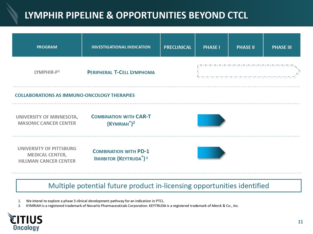 LYMPHIR LICENSING AND FDA PATHWAY Q3 2021: Citius Pharma Acquired the Exclusive License to Eisai’s E7777 in all Markets Except Japan and Parts of Asia from Dr. Reddy’s Q4 2021: E7777 Phase 3 Clinical Trial Completed (December) Q3 2021 Q3 2023 Q4 2021 Q3 2022 Q3 2022: Citius Pharma Filed BLA for New Formulation (E7777) in September CRL July 2023: remediation efforts underway • September 2021 • December 2021 • September 2022 • July 2023 Citius Pharma acquired the exclusive license to Eisai’s E7777 (LYMPHIR) Phase 3 clinical trial completed Citius Pharma submitted a BLA for E7777 (LYMPHIR) FDA issues complete response letter (CRL); Citius Pharma planning resubmission with remediation efforts underway 2024 2024: Anticipated commercial launch, if approved 10