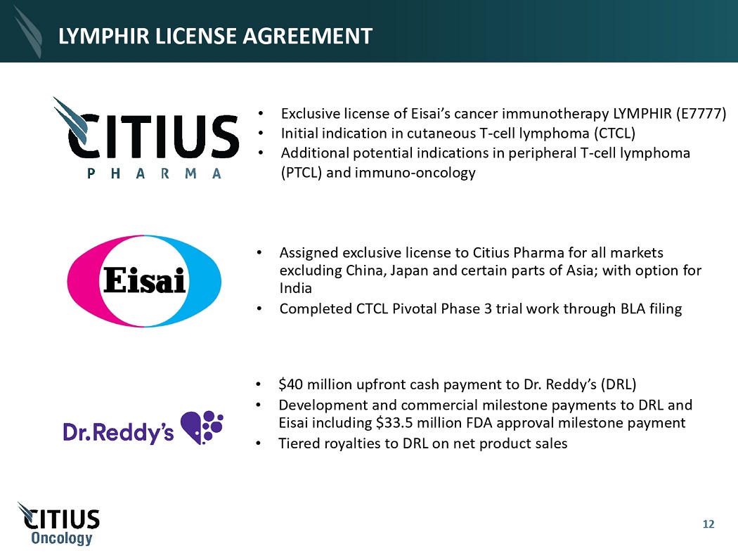 LYMPHIR PIPELINE & OPPORTUNITIES BEYOND CTCL PHASE III PHASE II PHASE I PRECLINICAL INVESTIGATIONAL INDICATION PROGRAM P ERIPHERAL T - C ELL L YMPHOMA LYMPHIR - P 1 C OMBINATION WITH CAR - T (K YMRIAH ® ) 2 UNIVERSITY OF MINNESOTA, MASONIC CANCER CENTER C OMBINATION WITH PD - 1 I N HI B I T OR (K EYTR U D A ® ) 2 UNIVERSITY OF PITTSBURG MEDICAL CENTER, HILLMAN CANCER CENTER COLLABORATIONS AS IMMUNO - ONCOLOGY THERAPIES 1. We intend to explore a phase 3 clinical development pathway for an indication in PTCL. 2. KYMRIAH is a registered trademark of Novartis Pharmaceuticals Corporation. KEYTRUDA is a registered trademark of Merck & Co., Inc. Multiple potential future product in - licensing opportunities identified 11