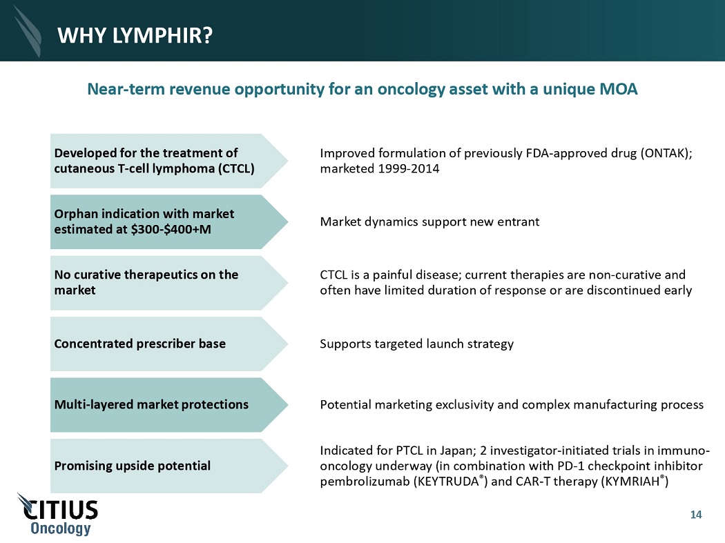 WHAT IS CUTANEOUS T - CELL LYMPHOMA (CTCL)? P l a que S t a ge T u m or S t a ge Considered to be incurable, CTCL is a general term for T - cell lymphoma that involves the skin, but may also involve the blood, lymph nodes, and internal organs CTCL accounts for approximately 4% of all non - Hodgkin lymphoma (NHL)* More prevalent in men than women and usually appears in patients in their 50s and 60s 60% 5% 37% M yc o s i s F u n go id e s S e zar y S y n d r o m e O t h e r C T C L Source: Company estimates. 13