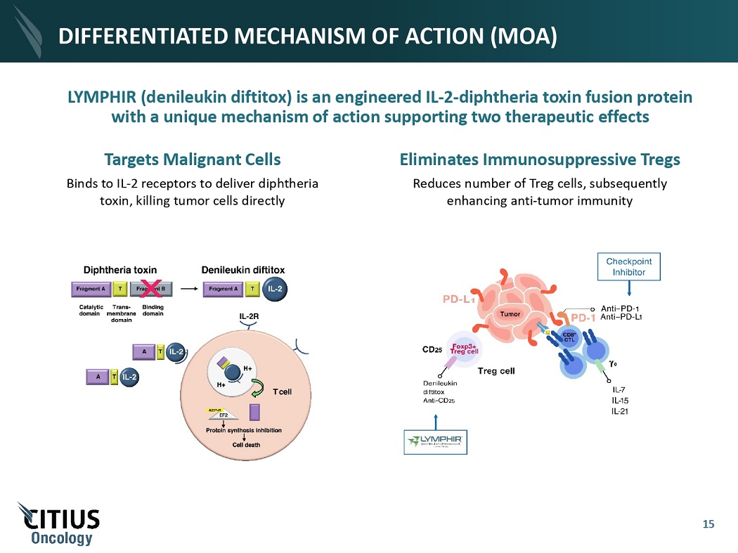 DIFFERENTIATED MECHANISM OF ACTION (MOA) LYMPHIR (denileukin diftitox) is an engineered IL - 2 - diphtheria toxin fusion protein with a unique mechanism of action supporting two therapeutic effects Targets Malignant Cells Binds to IL - 2 receptors to deliver diphtheria toxin, killing tumor cells directly Eliminates Immunosuppressive Tregs Reduces number of Treg cells, subsequently enhancing anti - tumor immunity 15