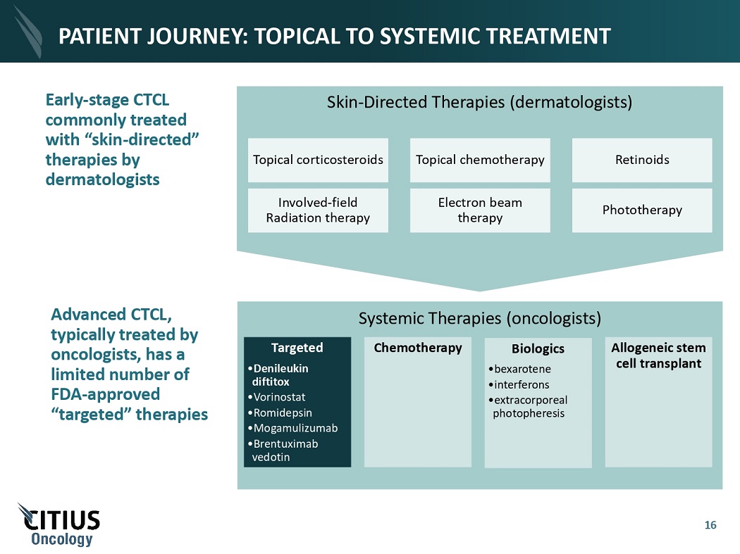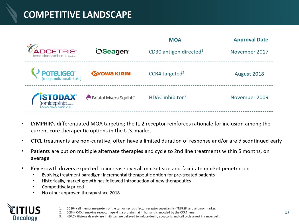 PATIENT JOURNEY: TOPICAL TO SYSTEMIC TREATMENT Systemic Therapies (oncologists) Targeted • De n il e uk i n diftitox • Vorinostat • Romidepsin • Mogamulizumab • B r e n tu x imab vedotin Chemotherapy Biologics • bexarotene • interferons • e x t r a c or p o r eal photopheresis Allogeneic stem cell transplant Advanced CTCL, typically treated by oncologists, has a limited number of FDA - approved “targeted” therapies Skin - Directed Therapies (dermatologists) 16 Topical corticosteroids Topical chemotherapy Retinoids Phototherapy Involved - field Radiation therapy E l e c t r on b ea m therapy Early - stage CTCL commonly treated with “skin - directed” therapies by dermatologists