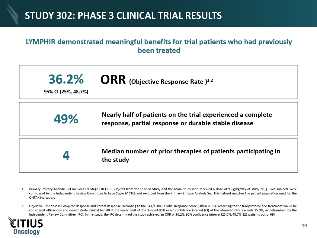 LYMPHIR PHASE 3 TRIAL (STUDY 302): COMPLETED Pivotal, multicenter, open - label, single - arm study of LYMPHIR in subjects with persistent or recurrent CTCL • A total of 69 subjects with Stage I - III persistent or recurrent CTCL from the Lead - In and Main Studies were included in the Primary Efficacy Analysis Set • Single trial as agreed to with FDA LEAD - IN STUDY n=21 MAIN STUDY n=71 Stage I - IV CTCL 18 All subjects were diagnosed with Mycosis Fungoides or Sézary Syndrome, with tumors assessed as positive for expression of the CD25 subunit of the IL - 2 receptor Doses ranged from 6 to 15 µg/kg/day 9 μg/kg/day was selected for the Main Study